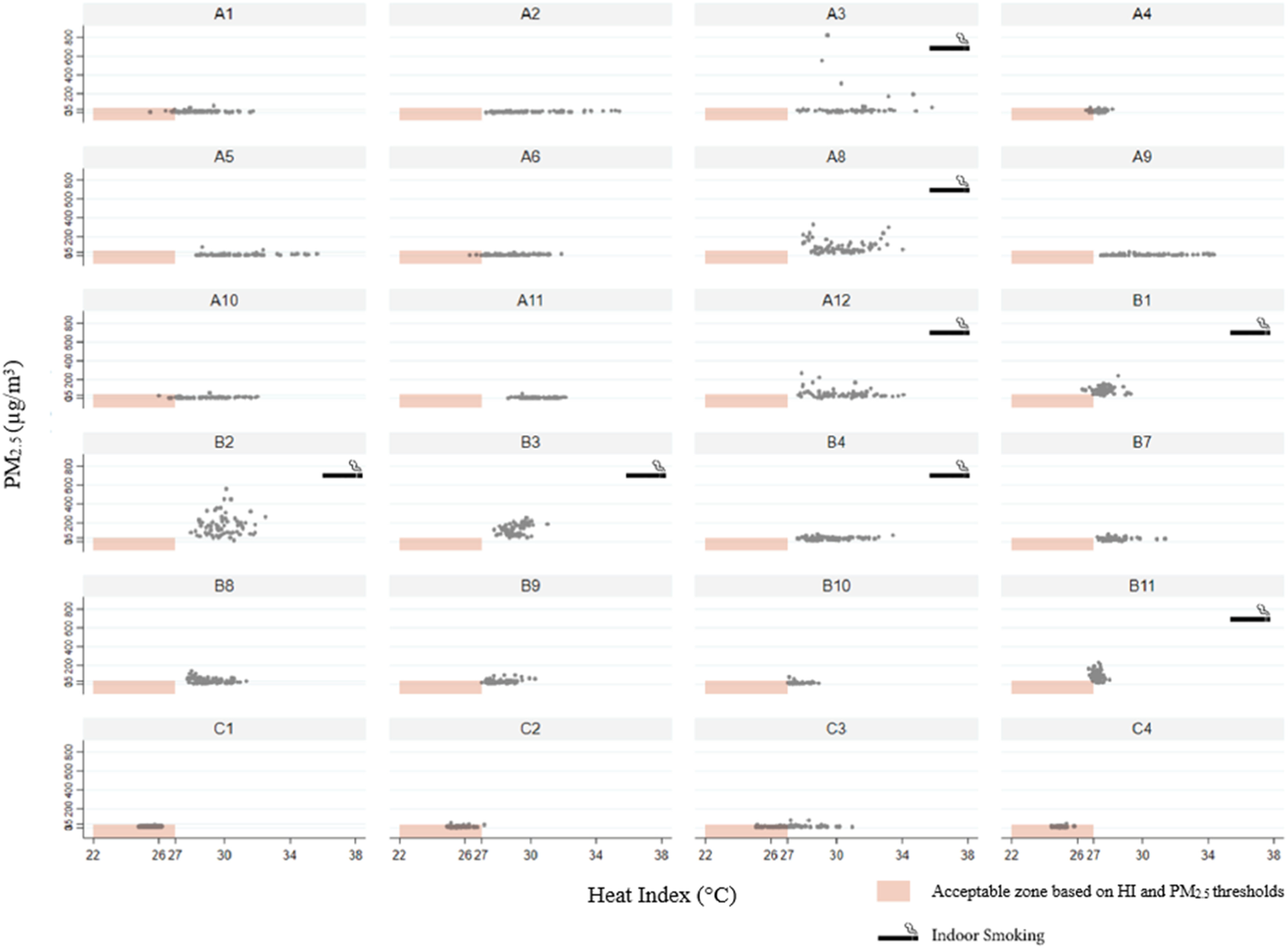 Yet, even in the newer LEED-certified building on site C where smoking was absent and residents reported operating the A/C, less than 50% of indoor HI and PM