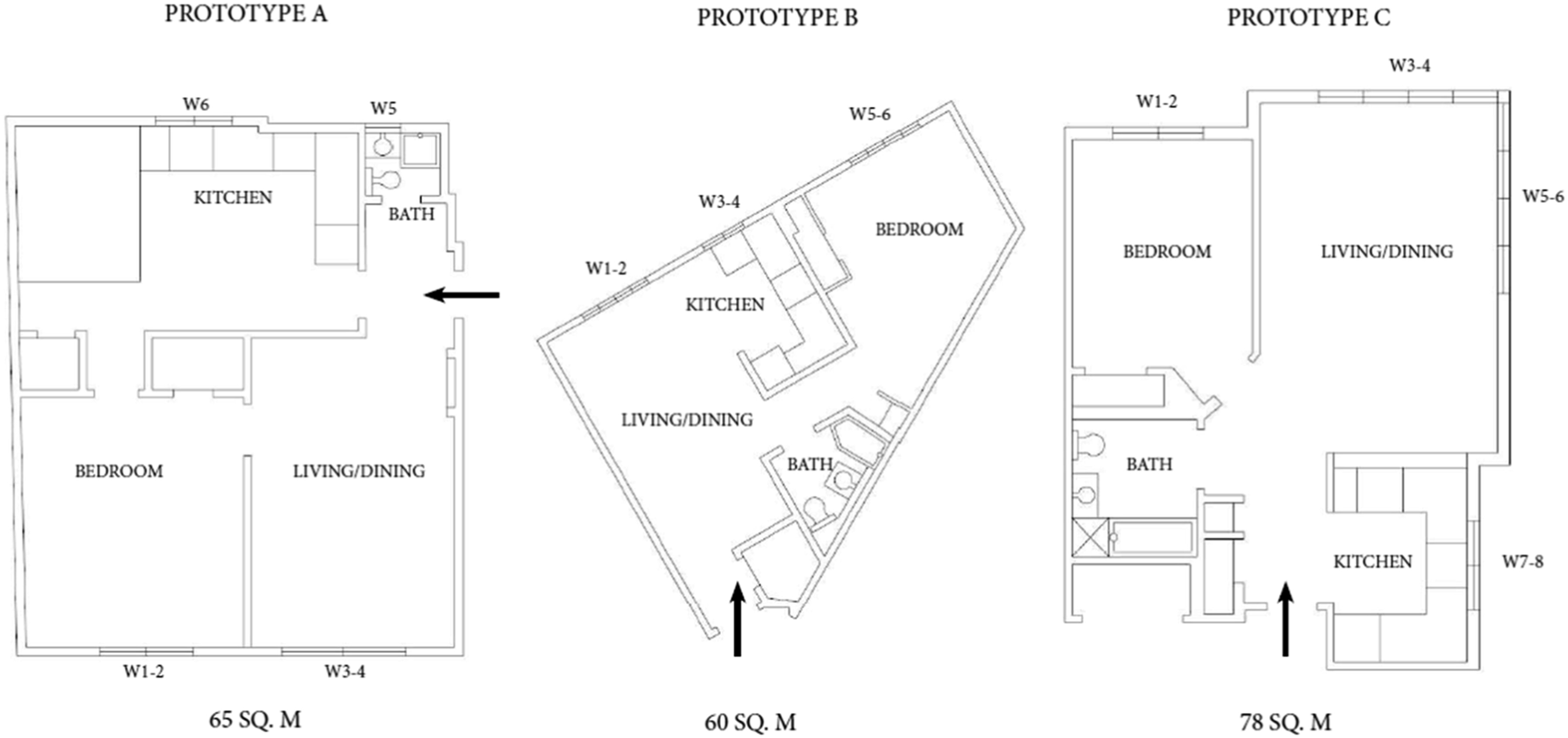 • Site C (2010s’ LEED-certified mid-rise): Built in 2011, it has a 4-storey green building (LEED-certified) of wood, steel and concrete with 31 apartments (1-bedroom) for seniors. The building has central A/C and its cost is included in the rent, but there are no outdoor amenities available. Windows are awing with single pane glass insulation. Average window dimensions are 0.7 m × 1.4 m with 40% openable area.