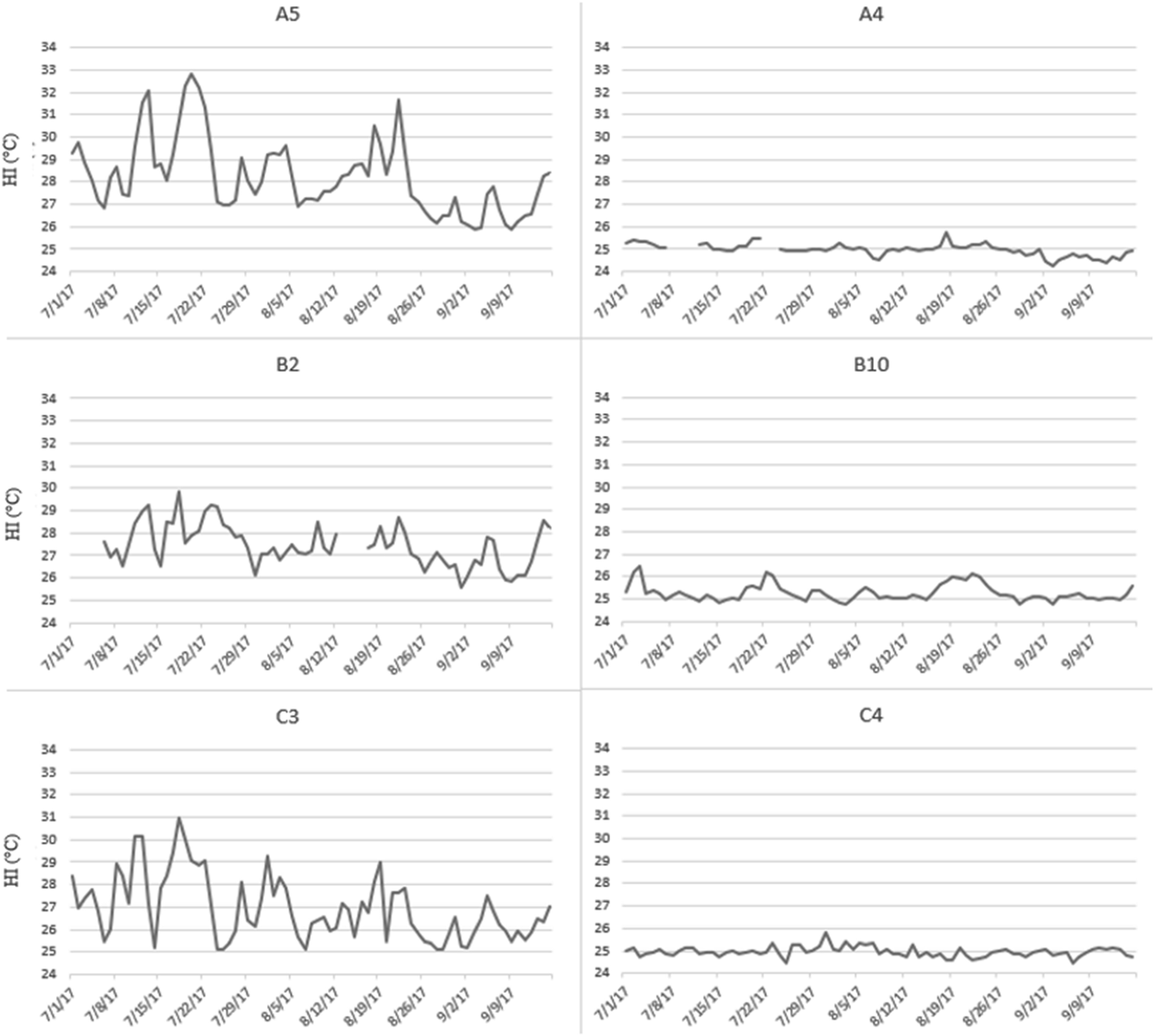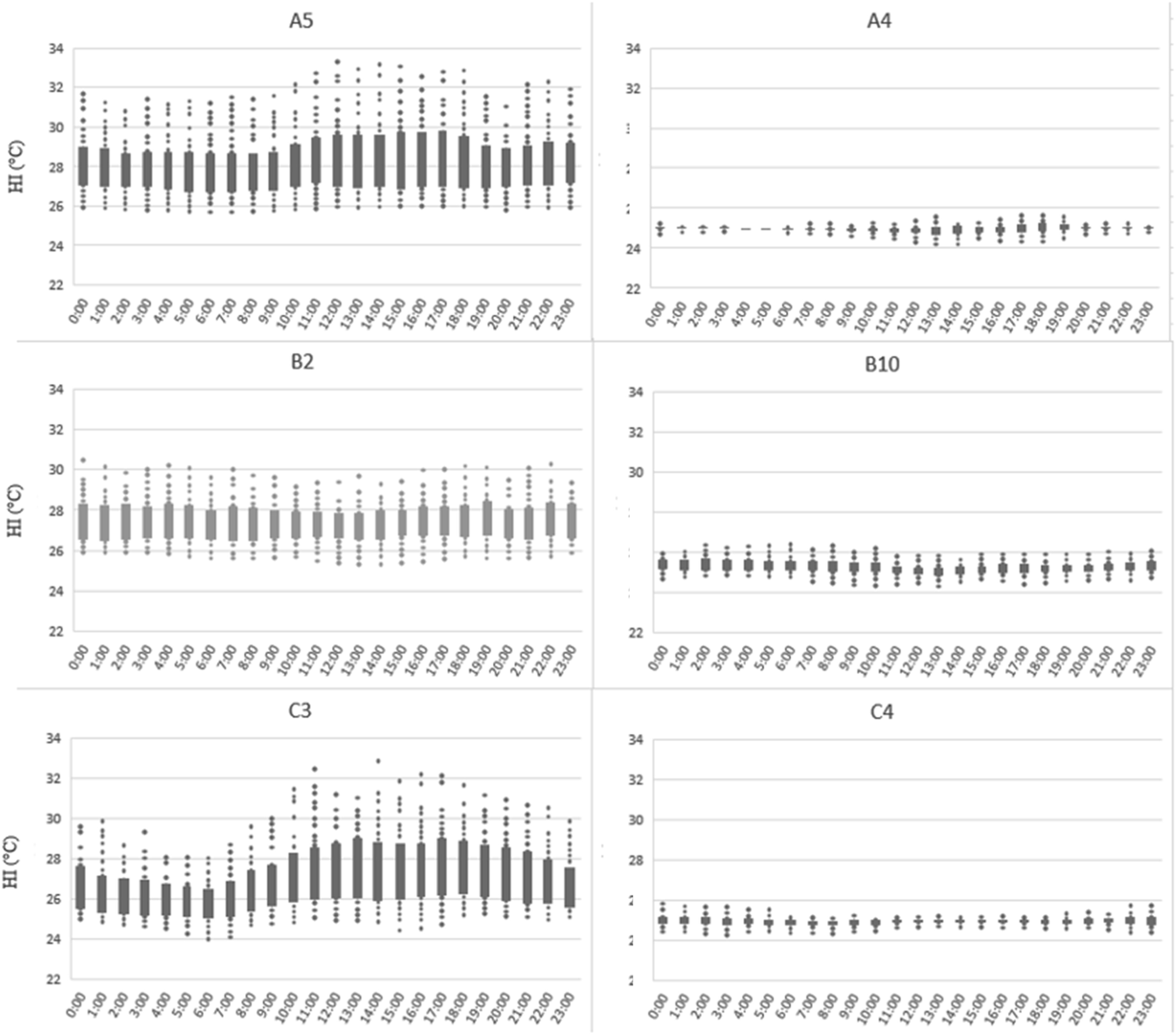 56 Therefore, in this work, we selected an indoor HI of 27°C as an overheating threshold, which corresponds to air temperatures of 26°C, 27°C and 28°C at relative humidity levels of 60%, 40% and 30%, respectively.