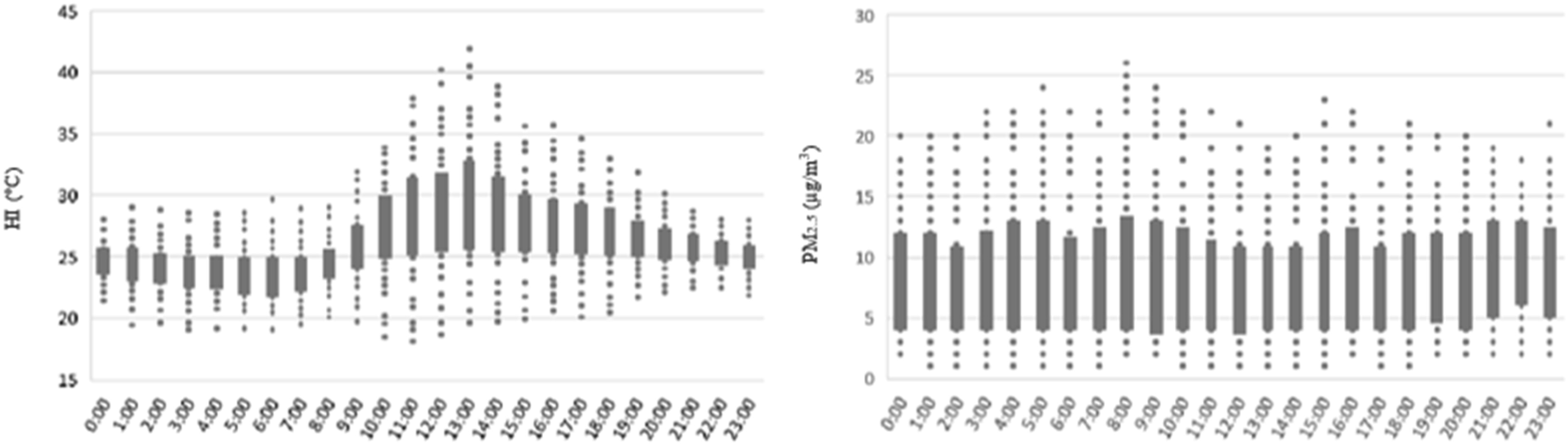 Continuous monitoring of indoor temperature, humidity and PM2.5 concentration reveals the prevalence of overheating and pollutants inside the public housing residences for seniors in Elizabeth, both during HW periods and on regular days of summer 2017. The daily average indoor HI and PM2.5 levels were above the thresholds of 27°C and 35 µg/m3, respectively, and far exceeded the outdoor levels, indicating poor insulation levels and the existence of indoor pollutant sources.