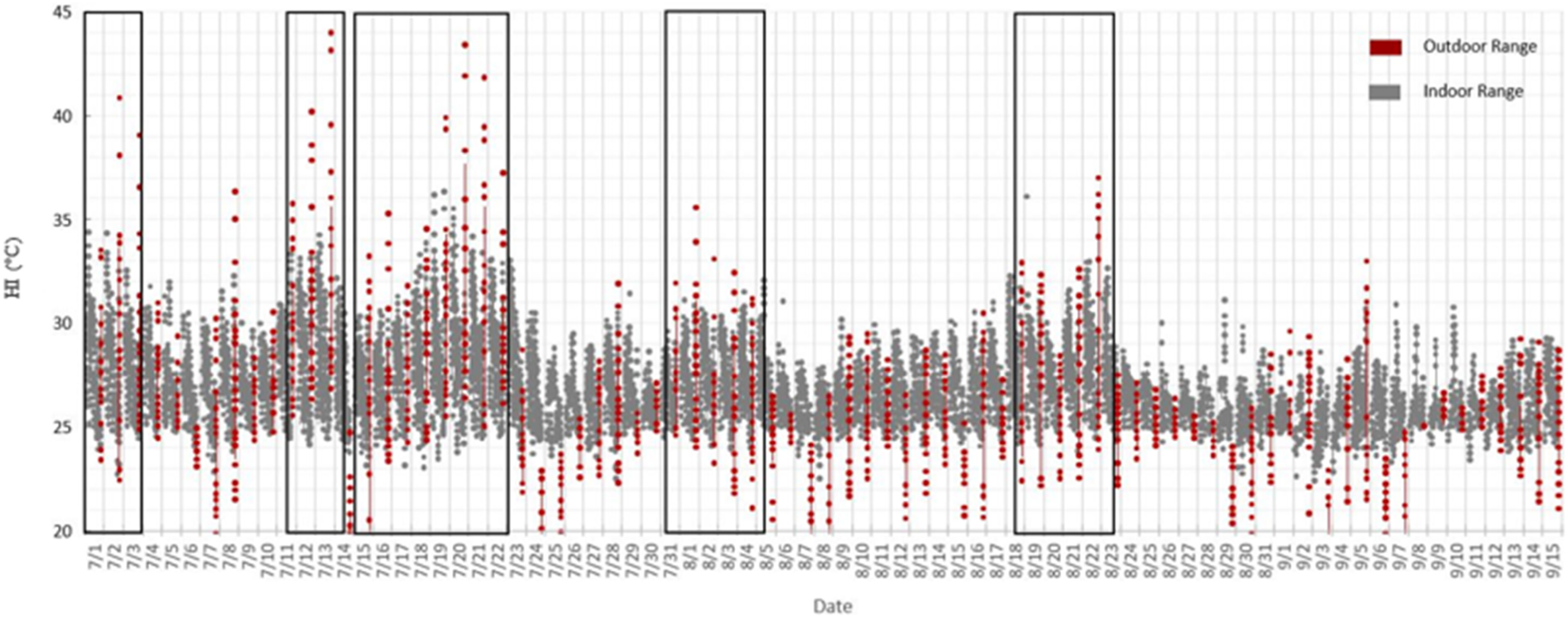 41,92 With regard to the latter, this is due to high indoor HI levels, which is an intuitive finding, especially when considering the poor building envelopes and the absence of central A/C in these buildings.