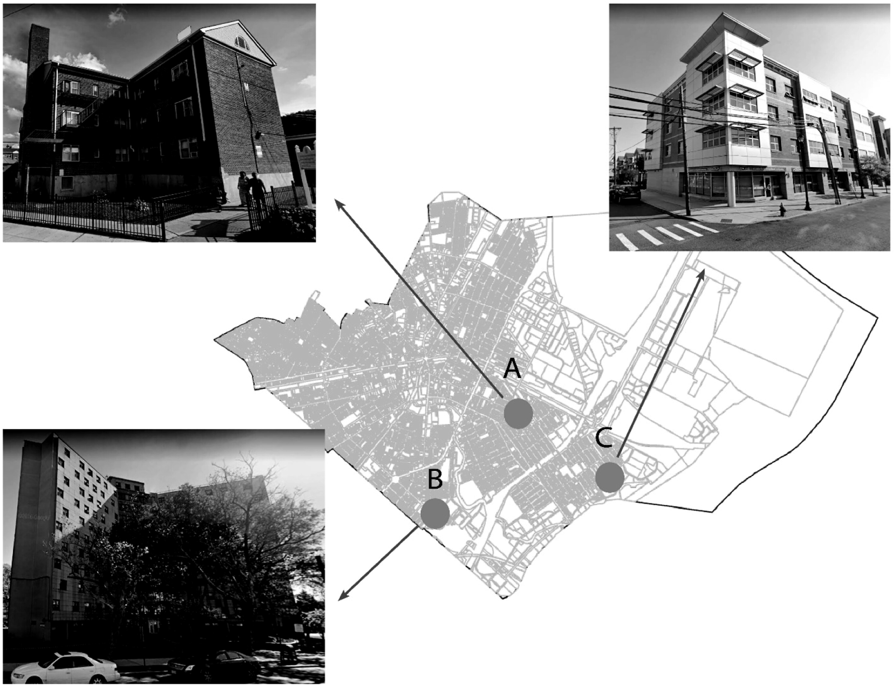 38After discussions and agreement with the housing authority, we first selected three different sites (A, B and C) with varied characteristics in buildings and surroundings in order to cover a range of US public housing types; these are summarized below and are shown in