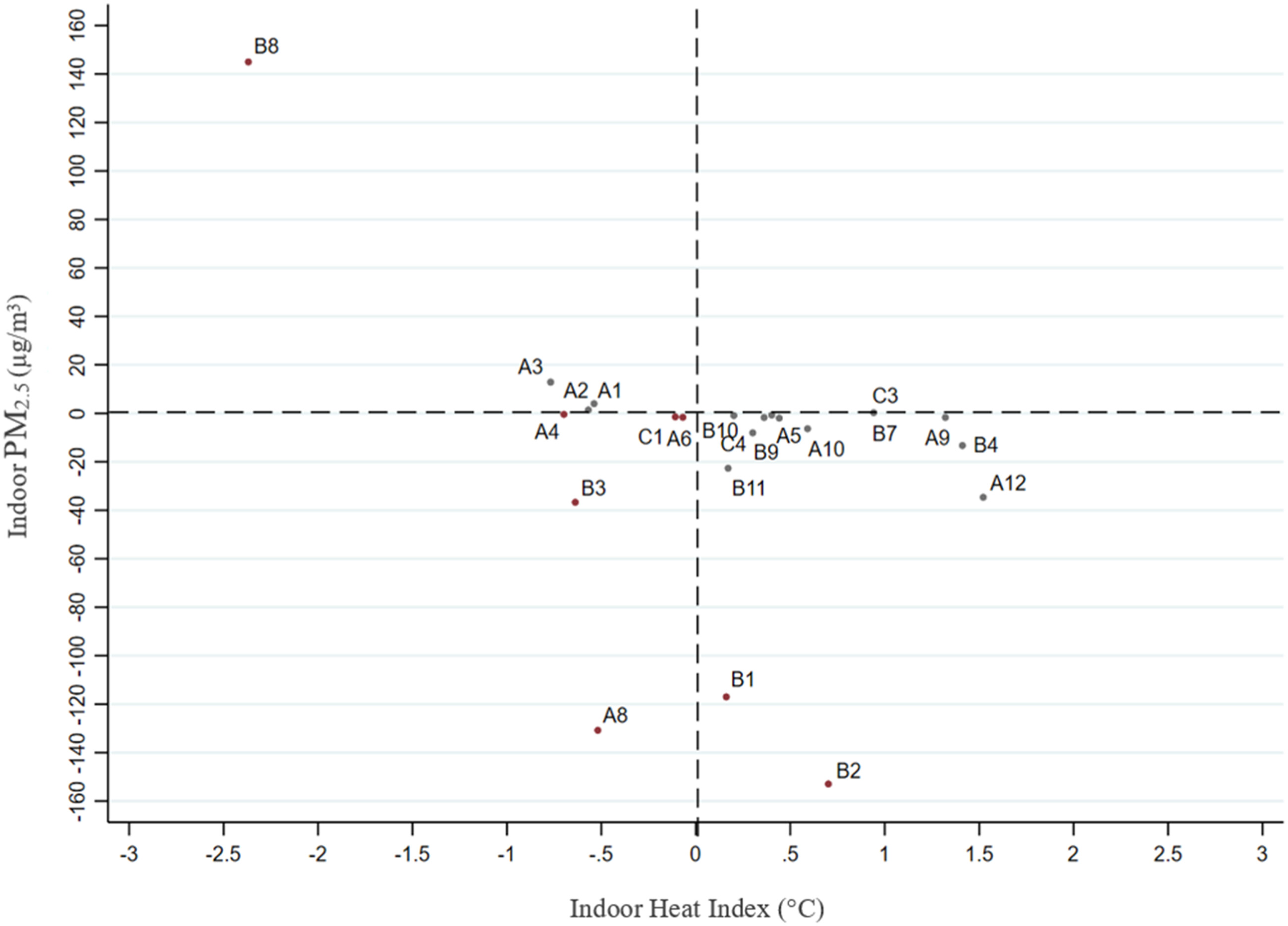 Opening windows in common spaces (kitchen-living room) are associated with a reduction of indoor PM2.5 concentration and an increase in indoor HI, so natural ventilation patterns in the two older sites might further contribute to the high HI levels. On average, residents of site B open the bedroom windows more frequently than the kitchen and living room windows, likely for some nighttime cooling. However, this does not help with reducing PM2.5 exposure from indoor sources, such as smoking. The reverse was observed on site A; residents keep the kitchen and living room windows open for almost 60% of the time, probably for daytime cooling, which might increase the amount of heat coming from outdoors.