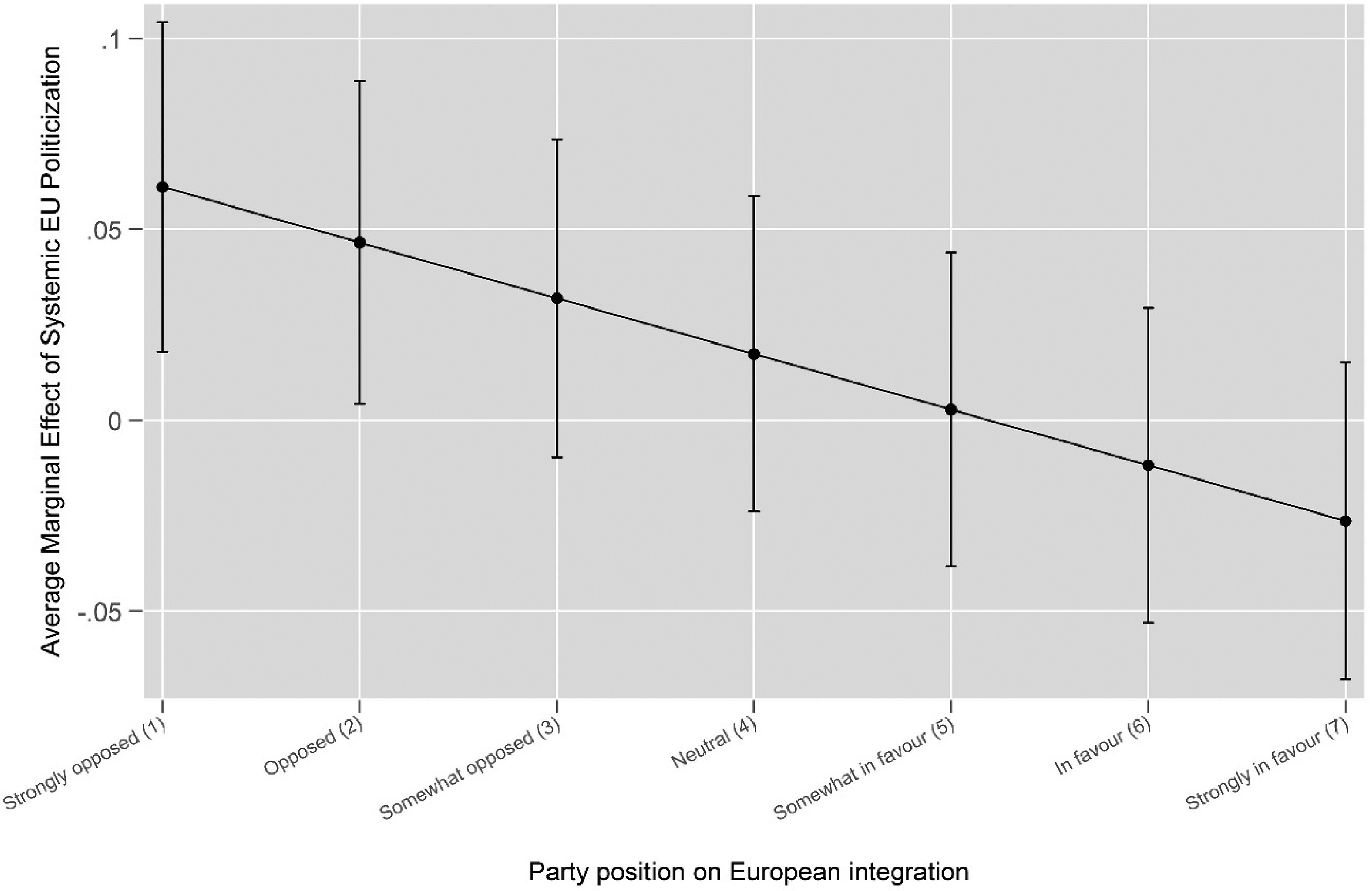 Figure 4 presents the average marginal effect (AME) of increasing systemic EU politicization by one unit for parties with different positions on European integration. Two things clearly stand out in