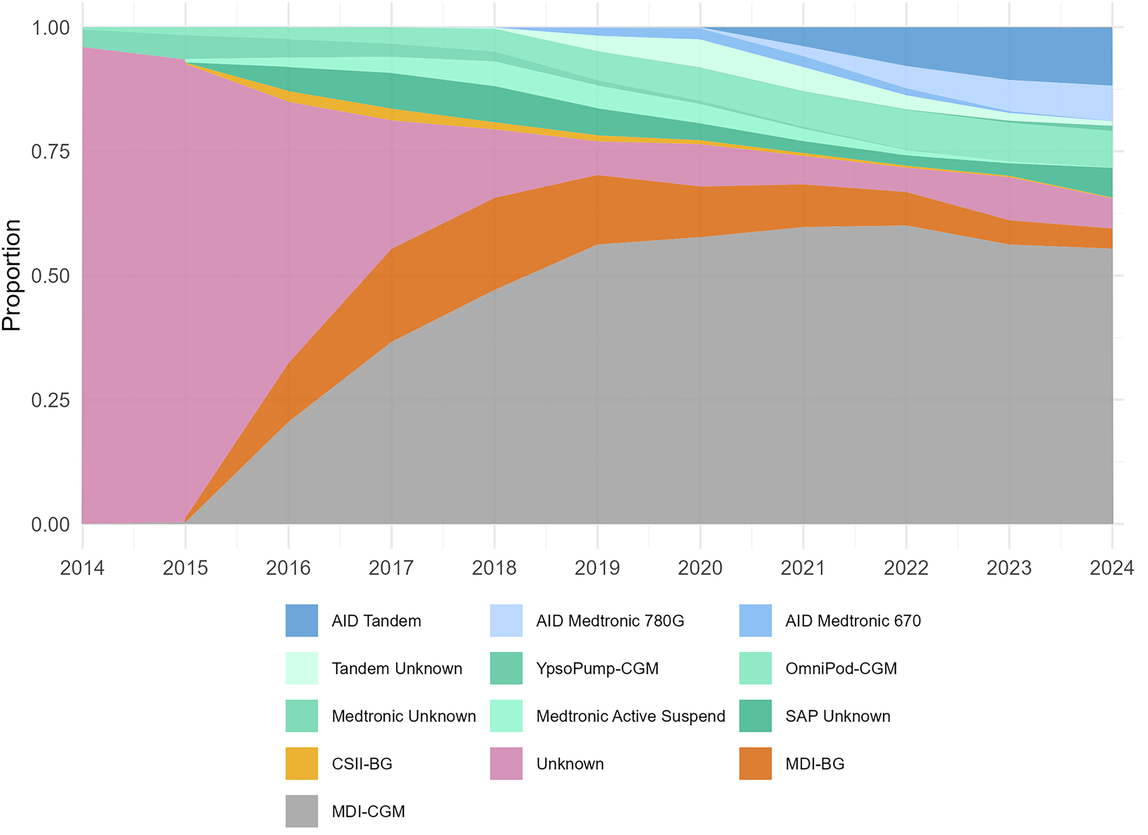 Fig. 2). The first years had a low rate of reporting of treatment, but, in 2017, about 80% of adults used MDI, and all pump users relied on non-AID therapy. Between 2015 and 2018, the use of CGM expanded rapidly, surpassing BG monitoring as the predominant glucose monitoring method by 2018.