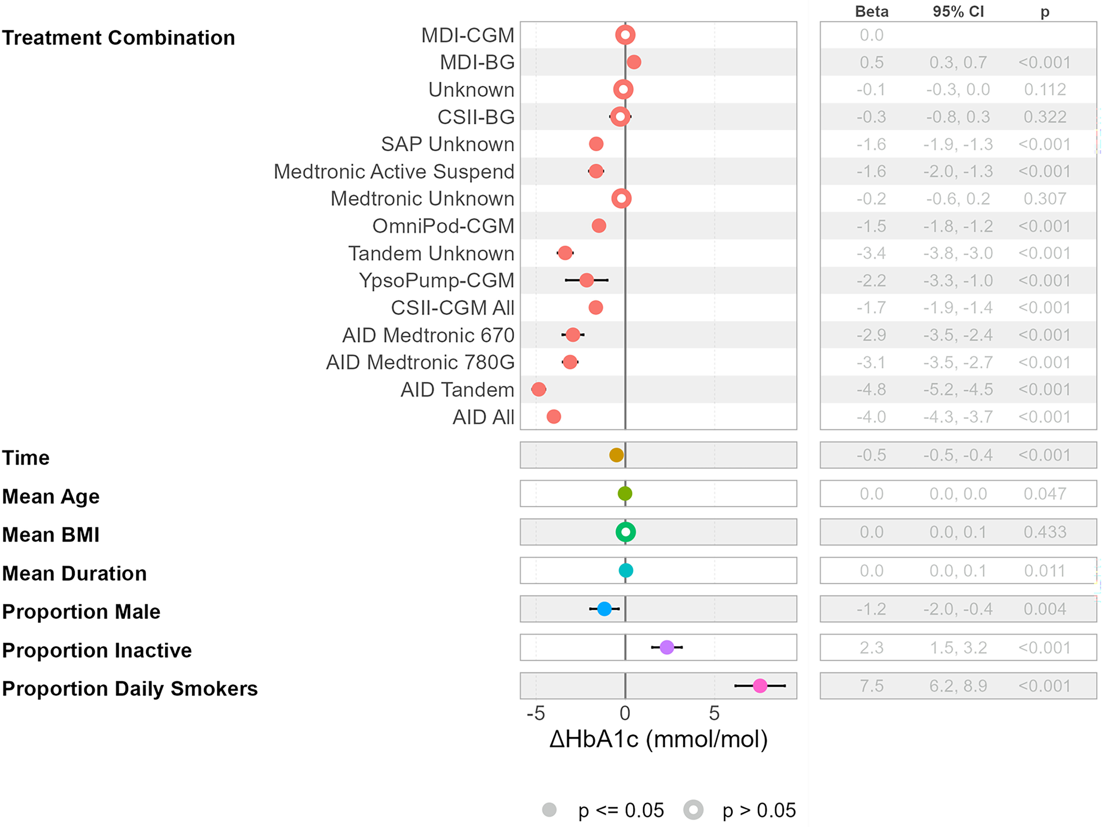 We applied linear mixed-effects regression to estimate adjusted differences in mean HbA1c across treatment combinations, with MDI-CGM as the reference. Fixed effects included the base characteristics (