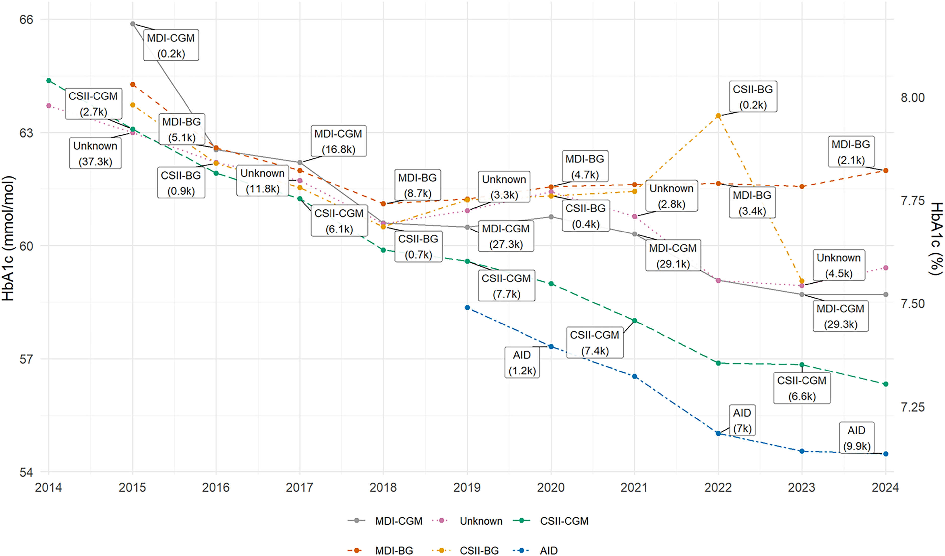 Fig. 1). Patients treated with MDI-BG showed the slowest improvement, with mean HbA1c stabilizing around 63 to 64 mmol/mol after 2020. By contrast, patients using CGM in combination with either MDI or insulin pumps demonstrated sustained reductions. The most pronounced improvements were seen among users of AID systems, who reached mean HbA1c levels below 55 mmol/mol by 2024.