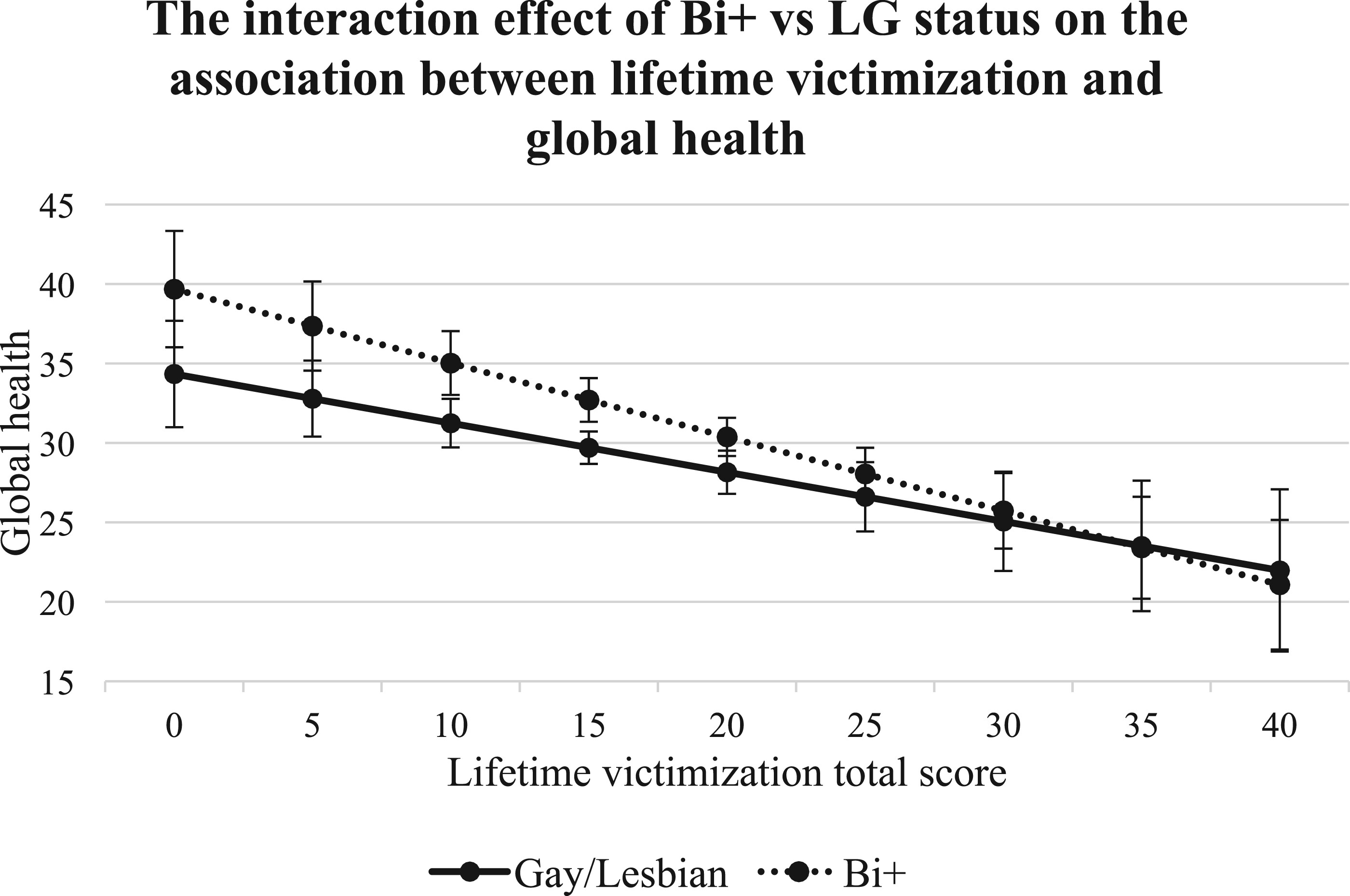Bi+ caregivers in this study reported higher global health scores than g/l caregivers. Research consistently demonstrates that bi+ people experience significant mental health disparities compared with their monosexual g/l and heterosexual counterparts,
