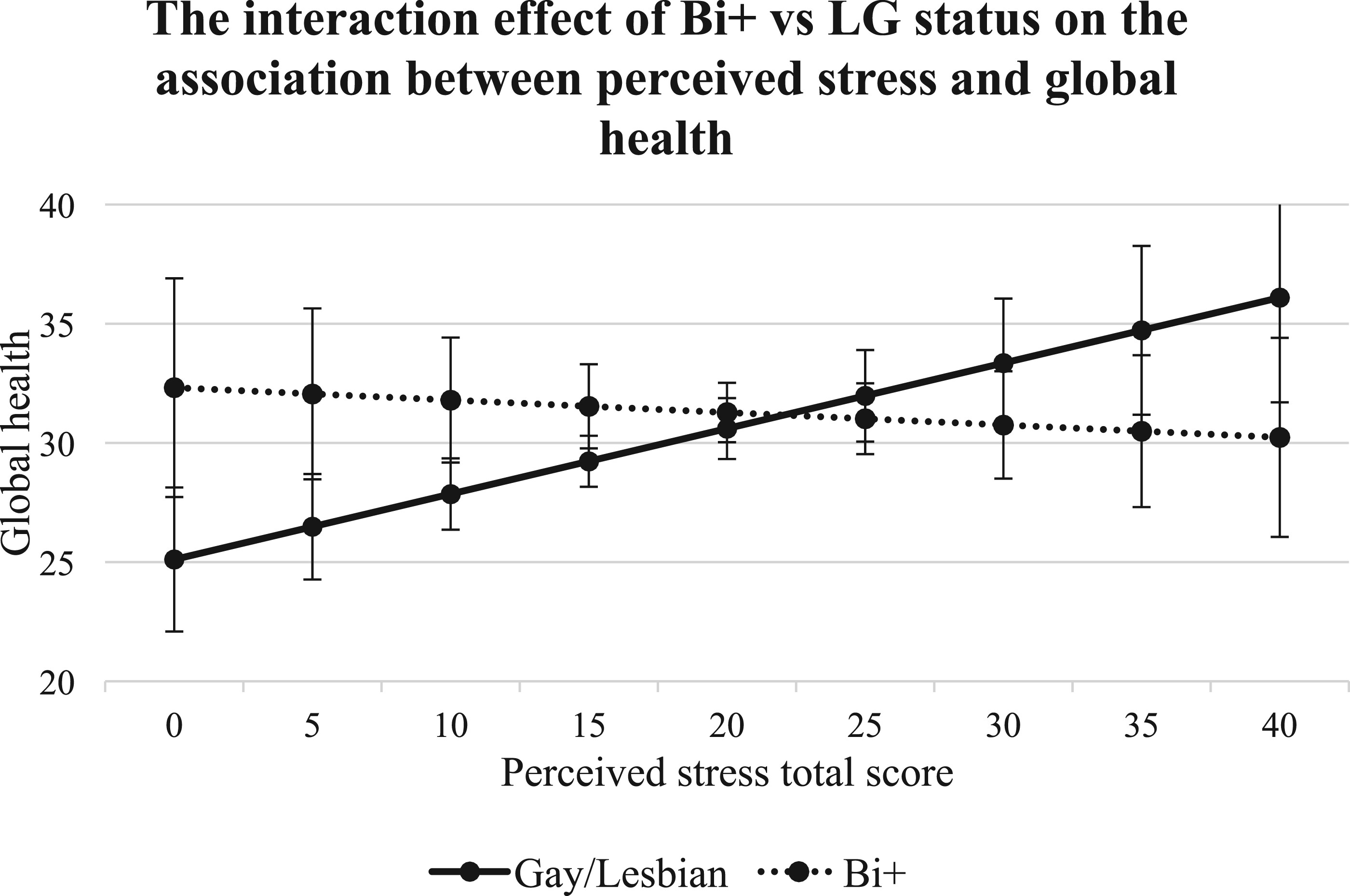 21Unexpectedly, we found that perceived stress was positively associated with global health and this association differed between bi+ and g/l caregivers. Higher perceived stress scores predicted worse global health for bi+ caregivers, yet higher perceived stress scores predicted better global health for g/l caregivers. While we did not examine social connection in the current study, one possible explanation for this finding could be related to differences in social connection between the two groups. For example, g/l caregivers in our sample who report high levels of stress may turn to LGBTQ+ community-serving organizations for support and social engagement. Programs offered by LGBTQ+ community-serving organizations are often tailored to g/l individuals, with limited offerings specifically designed for bi+ community members.