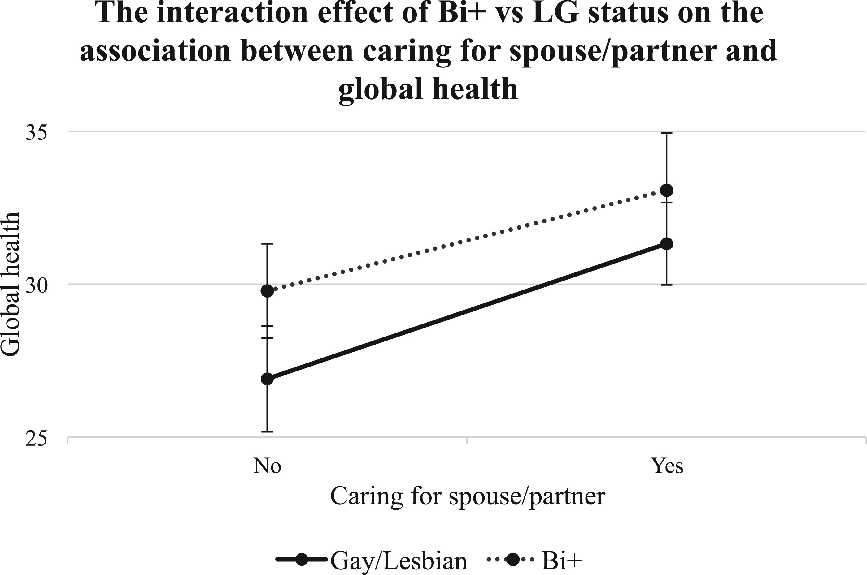 21 that examined health-related quality of life among lesbian and bisexual women, which found a higher likelihood of poor general health among bisexual women than lesbians. Additionally, the higher global health scores observed among bi+ caregivers may, in part, be attributed to the proportion of individuals in this group caring for a spouse or partner, compared with g/l caregivers, as previous studies suggest that spousal and partner caregivers often experience poorer physical and mental health outcomes than non-spouses/partners.