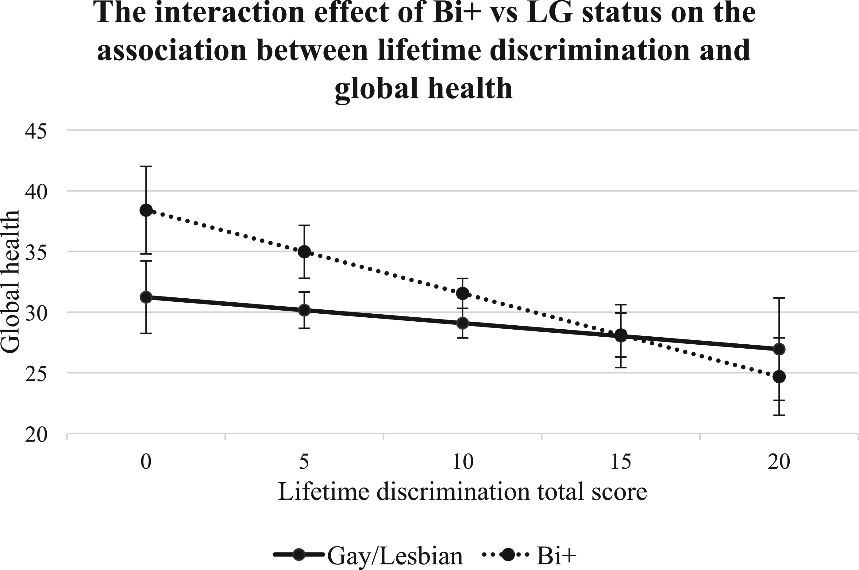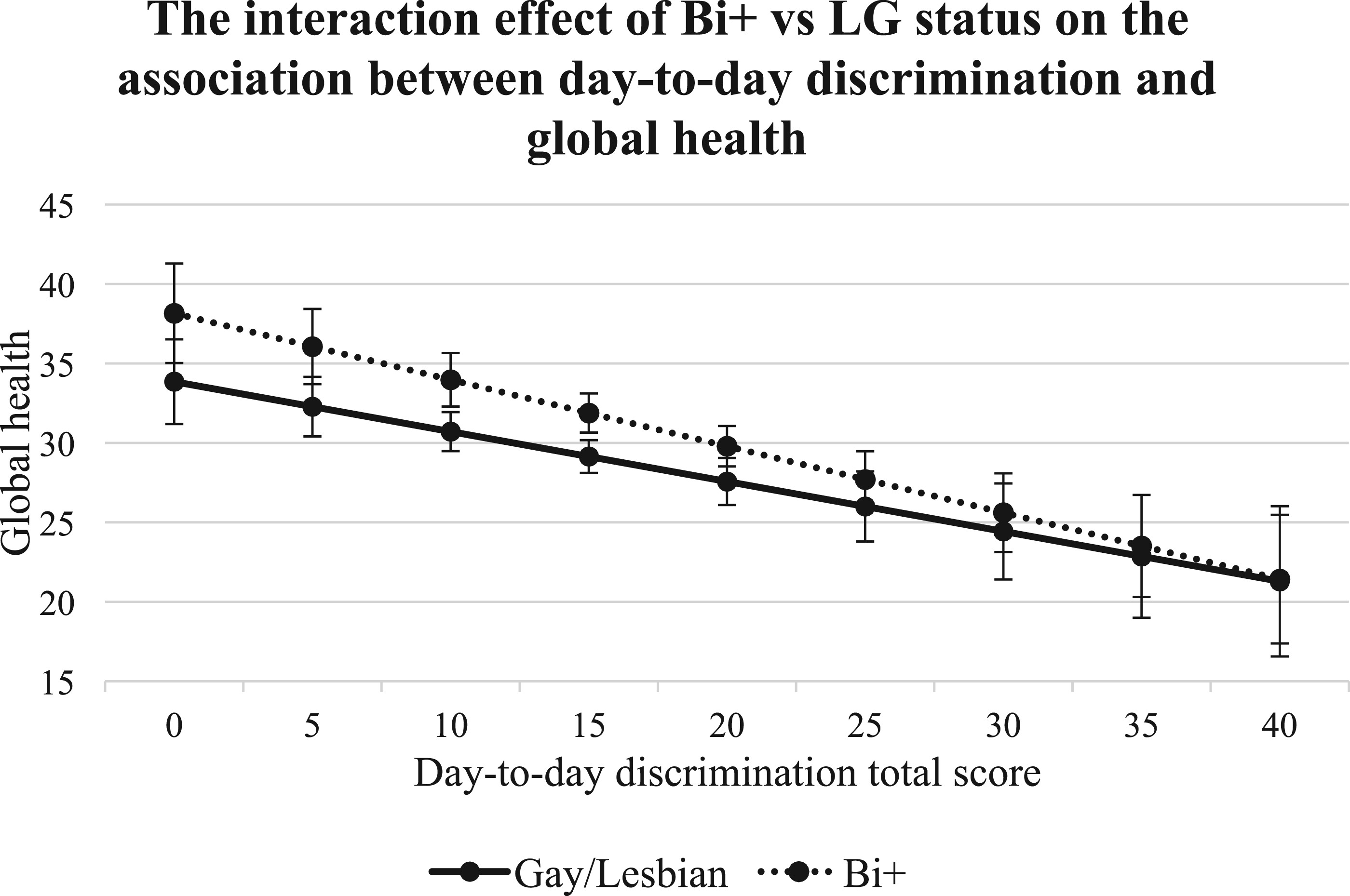 7-9,11,12 In line with this evidence, the present study found that lifetime discrimination, lifetime victimization, daily discrimination, and microaggressions were negatively associated with global health among both bi+ and g/l ADRD caregivers. Notably, higher lifetime discrimination scores predicted poorer global health for both groups, with the magnitude of this association being stronger for bi+ caregivers compared with g/l caregivers. These findings underscore the existence of health disparities within the bi+ caregiver population and highlight the presence of bi+-specific minority stress, at least in terms of lifetime discrimination, on global health. These results are consistent with minority stress theory,