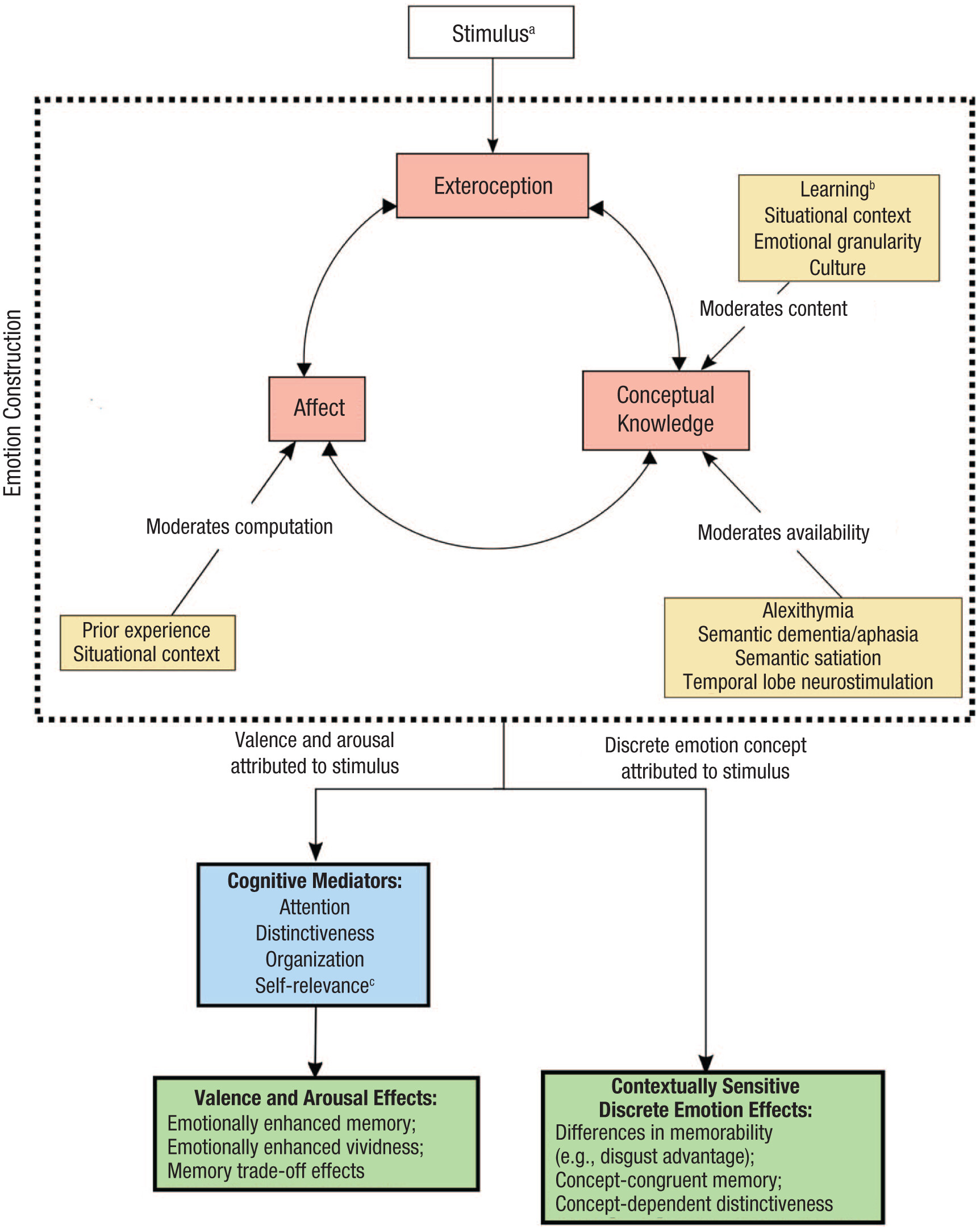 Table 1). In particular, the CMEM predicts that (a) the availability, accessibility, and use of emotion concepts during emotion construction will bias the way that stimuli are remembered; (b) the effects of valence, arousal, and discrete emotions will depend on the availability of conceptual emotion knowledge; and (c) variability in emotion construction at the situational, individual, and cultural levels will influence how emotions affect memory.