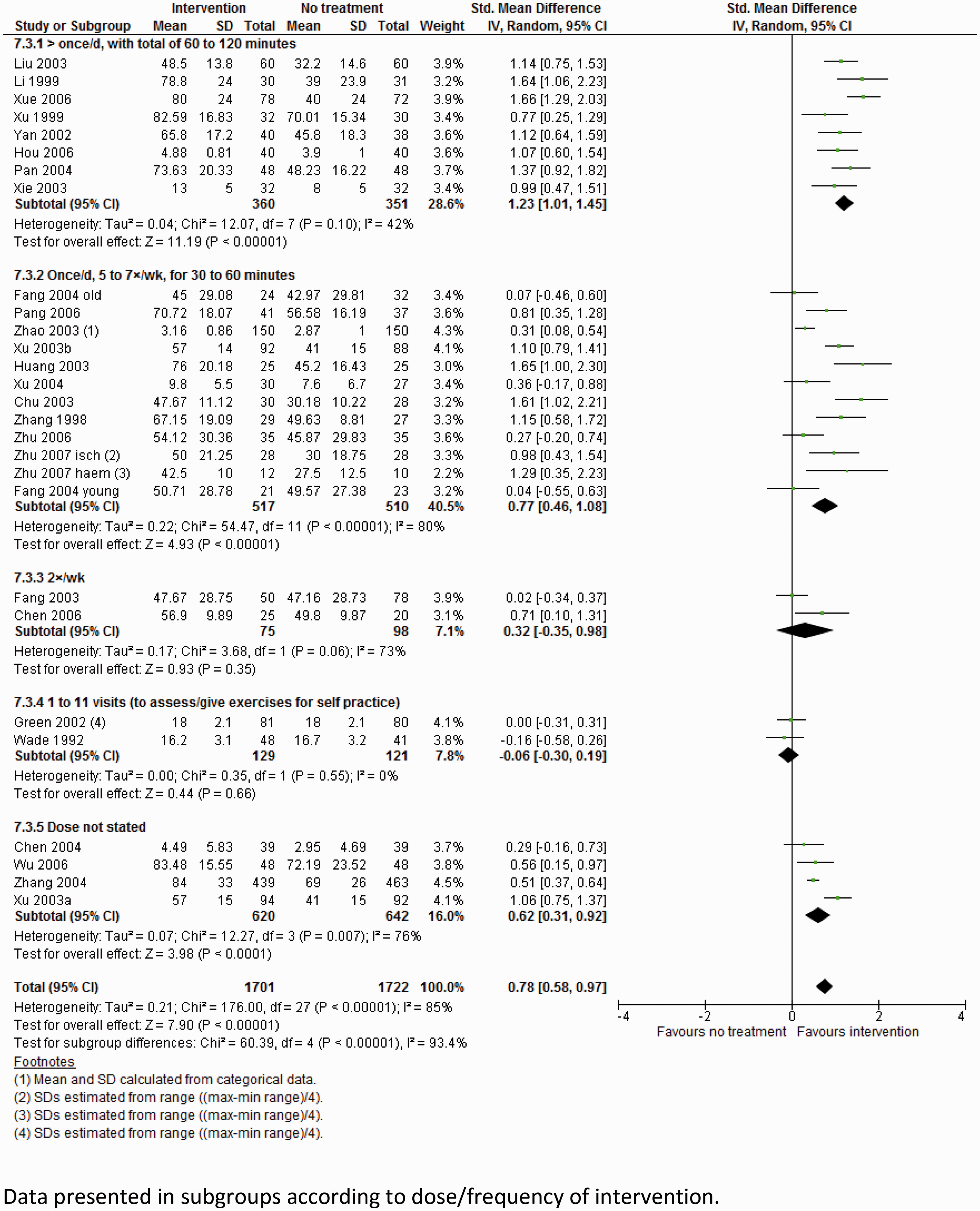 | Relevant subgroup analyses to consider: • Effects of therapy given at different times after stroke (<1 week, 1–3 weeks, or 3–6 weeks). • Effects of therapy in different parts of the world (Europe, Australasia, America, Asia). • Effects of therapy at different doses/intensities (> 45 min/day, 30–45 min/day, 15–30 min/day, <5 sessions/week, <2 sessions/week). • Effects of therapy delivered by different professions (physiotherapist, nurse, assistant therapist, carer/family member). • Effect of different specific therapy approaches (e.g. Bobath approach, motor learning approach, orthopedic methods). |
