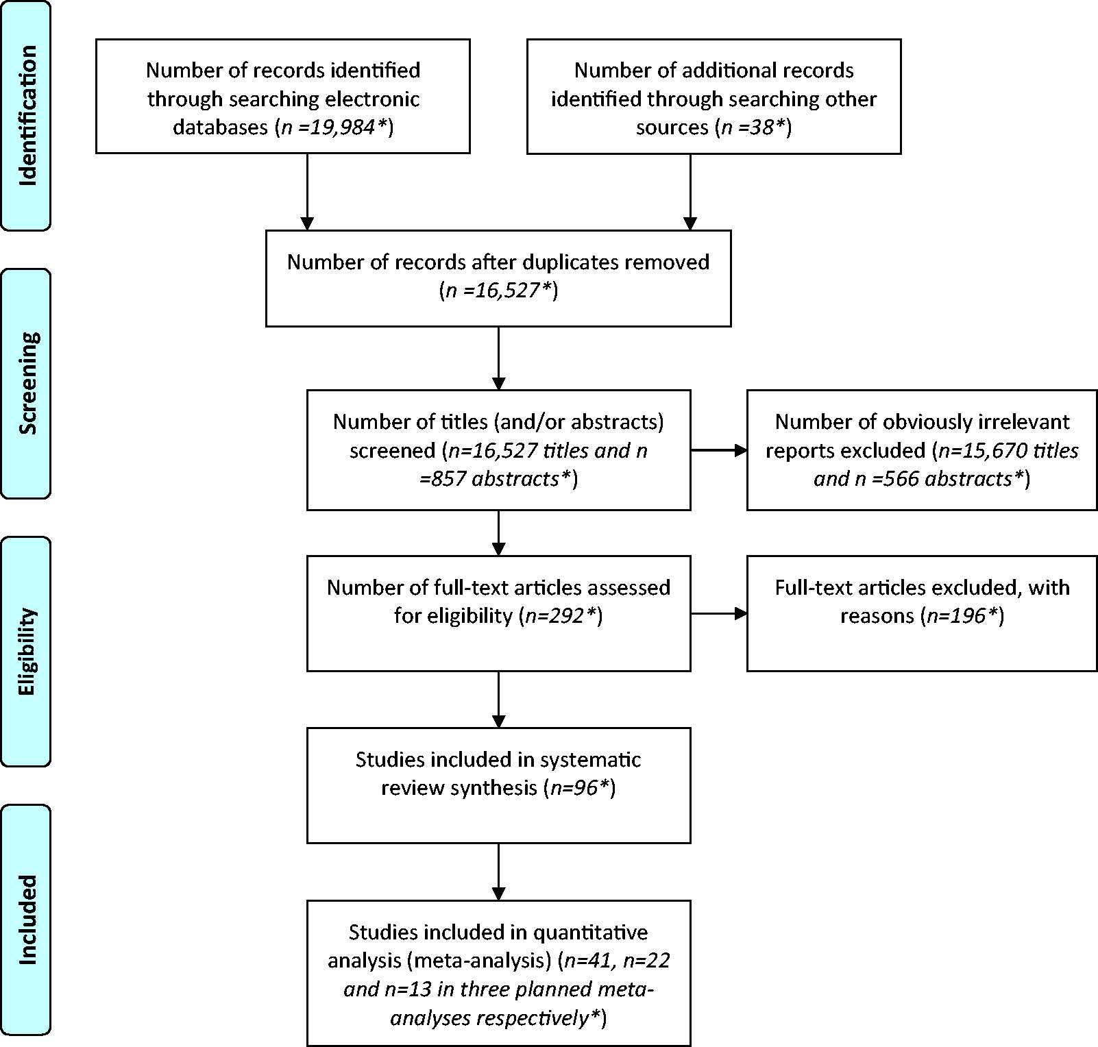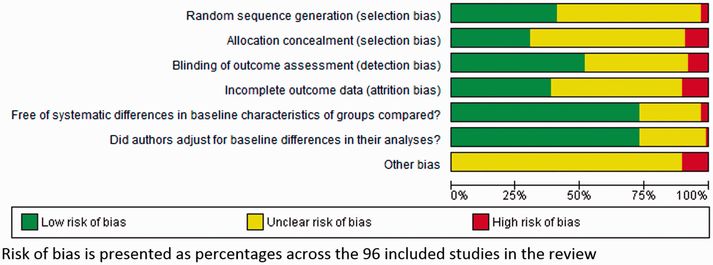 | Reporting bias (including publication bias, and selective outcome reporting) | There are systematic differences between reported and unreported findings. | Comprehensive searching for all eligible studies (regardless of publication status) can help avoid publication bias. Pre-specification of outcome measures within a published protocol can help avoid selective outcome reporting. Statistical methods can be used to aid detection of reporting biases (funnel plots and sensitivity analyses). | Trials published in non-English language and in Chinese journals may not all have been identified70 |