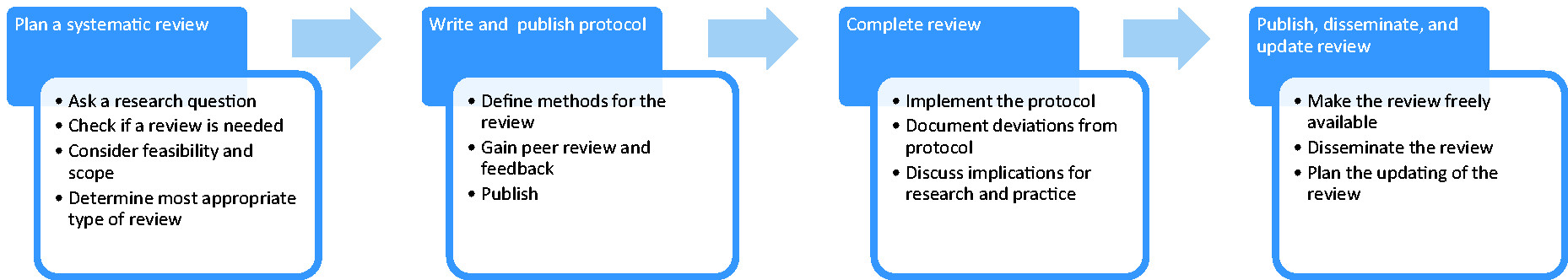 | What is the effectiveness of an intervention (e.g. a treatment, service or policy)? | Intervention review | What is the safety and effectiveness of thrombolytic therapy for the treatment of acute ischaemia stroke?15 What is the effect of stroke unit care, as compared to alternative forms of care for people following a stroke?16 Does fitness training after stroke reduce death, dependence and disability?17 | PICO: Population, intervention, comparison, outcome PICOS: Population, intervention, comparison, outcome, study type PICOT: Population, intervention, comparison, outcome, timeframe18 PICOC: Population, intervention, comparison, outcome, context | Cochrane Handbook for intervention reviews19 Joanna Briggs Institute (JBI) Reviewers’ manual20 Standards for Systematic Reviews of Comparative Effectiveness Research21 Methodological Expectations of Cochrane Intervention reviews (MECIR)22 | Cochrane risk of bias tool23 JBI Critical appraisal tools24 | Preferred reporting items for systematic reviews and meta-analyses (PRISMA)25 Methodological expectations of cochrane intervention reviews (MECIR)22 |