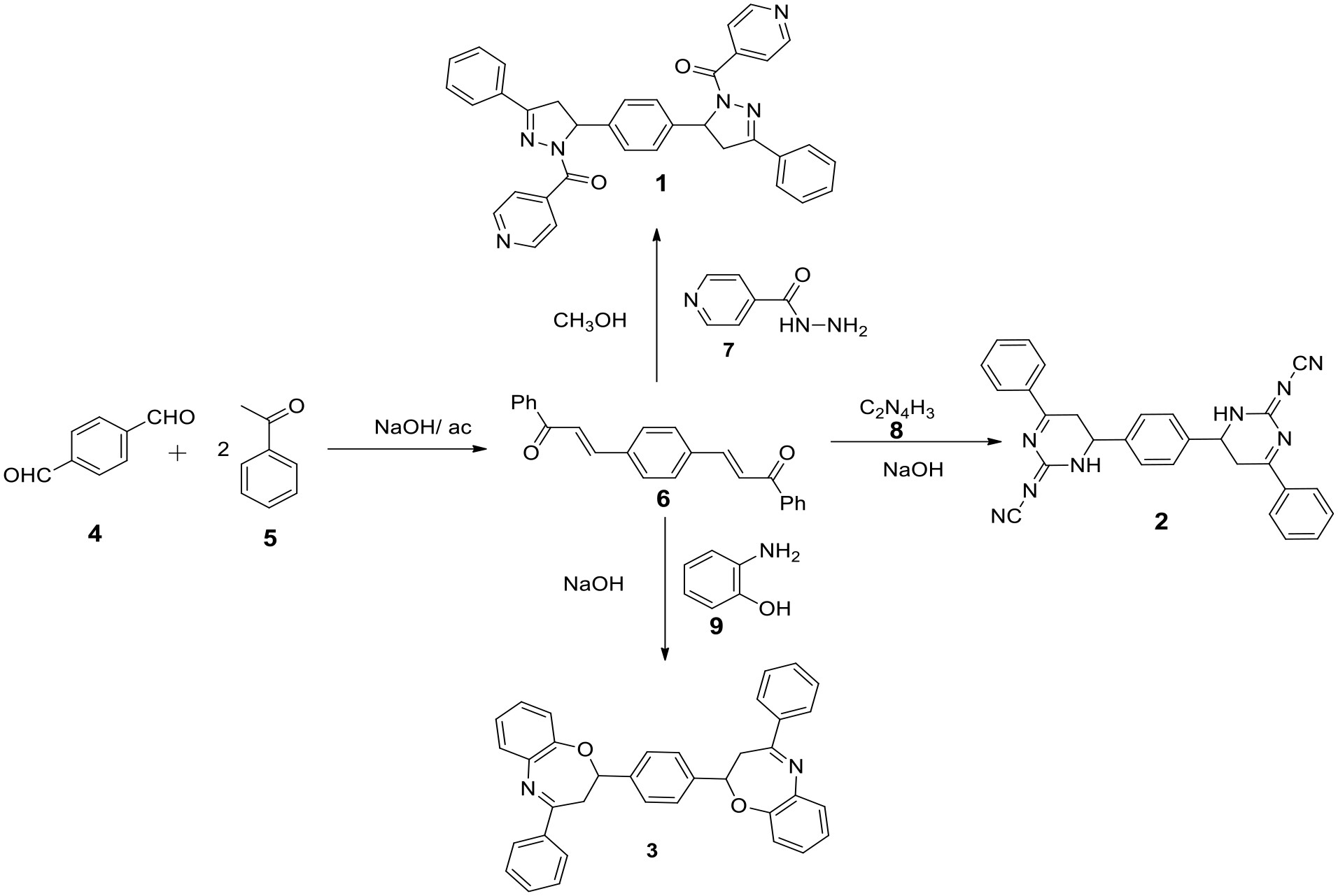 15–17We here report the design and synthesis of three new bis-heterocyclic compounds from a bis-chalcone that was prepared by the reaction between acetophenone and terephthalaldehyde using the Claisen–Schmidt method. The title compounds were tested and their antimicrobial activities on three bacteria and two types of fungi were studied.