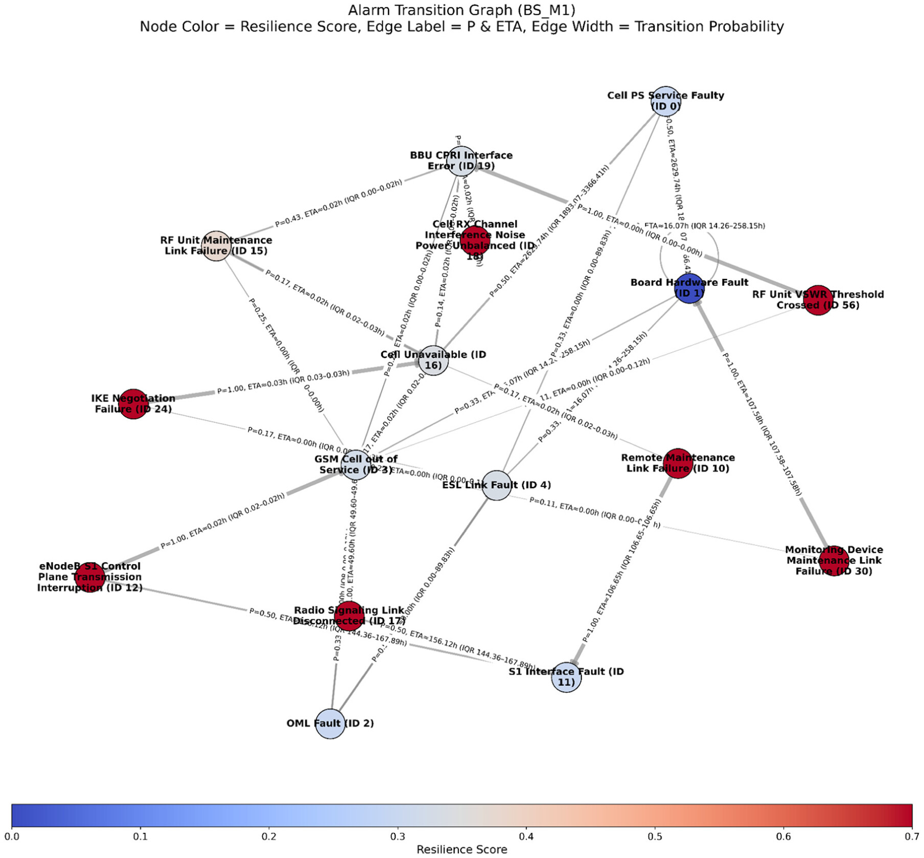 Where , , and are the normalised cascade entropy, self-loop probability, and absorption probability for alarm AI, computed across all alarms in the set. A higher indicates greater resilience (i.e. the alarm is less likely to propagate, less prone to repetition, and more likely to resolve). The weights , , and specify the relative importance of the three metrics and can be tuned according to operational priorities. The weights are set to , , and to prioritise alarms that demonstrate containment and recovery over those that propagate in this work. These weights can be experimentally tuned based on expert feedback and requirements analysis with network infrastructure stakeholders (managers and maintenance engineers).