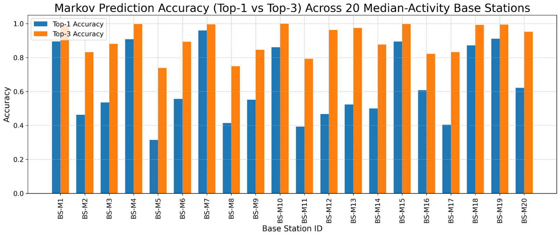 RQ2 Predictive Modelling: To what extent can first-order Markov models accurately forecast the next alarm events in time-ordered sequences, and how does this vary across base stations with differing activity levels?