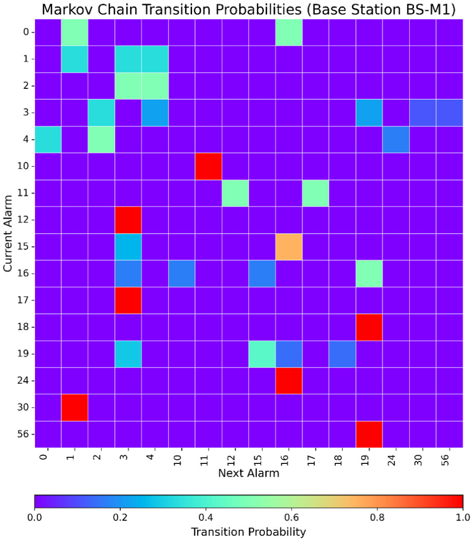 Algorithm 1) is used to record every observed transition between consecutive alarms. Within each S, every pair of consecutive alarms’ transitions is recorded. A count matrix keeps track of these grouped transitions and records how often an alarm is followed by another. The raw counts are converted to transition probabilities by normalising each row of the count matrix. This resulting probabilistic transition matrix represents the likelihood of each possible next alarm and forms the basis of the Markov model.
