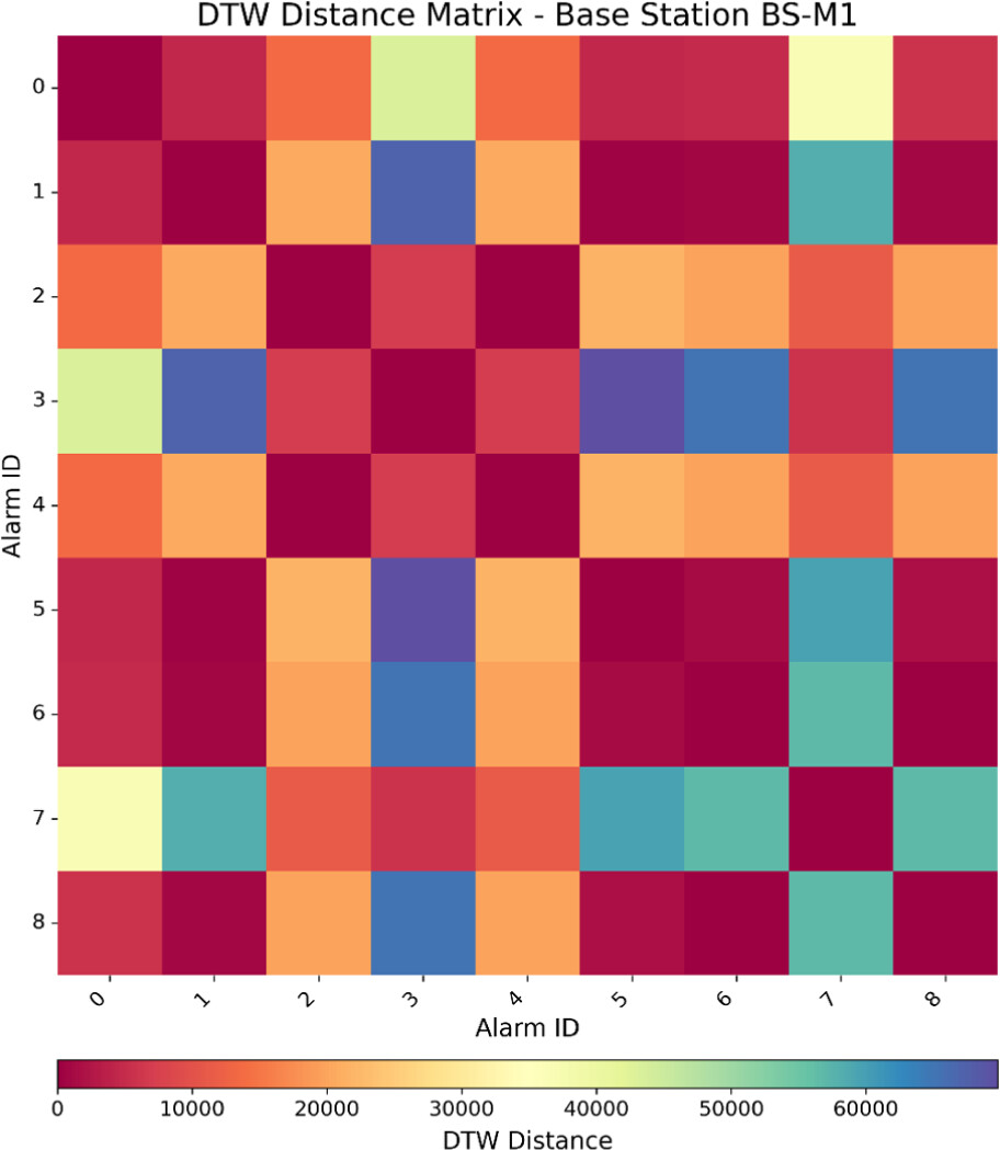 The quantification of similarity between each base station’s temporal alarm activation profiles is implemented using Dynamic Time Warping (DTW). This results in a symmetric matrix containing pairwise distances representing the temporal relationships among all valid alarms (a DTW matrix is illustrated as a heatmap in