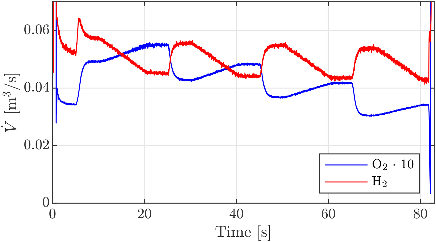 13. Furthermore, the hydrogen volumetric flow rate does only barely change between the different pressure stages and shows an anti-proportional temporal evolution during constant chamber pressures. For that reason, only hydrodynamic effects of the LOX flow will be investigated in this study.