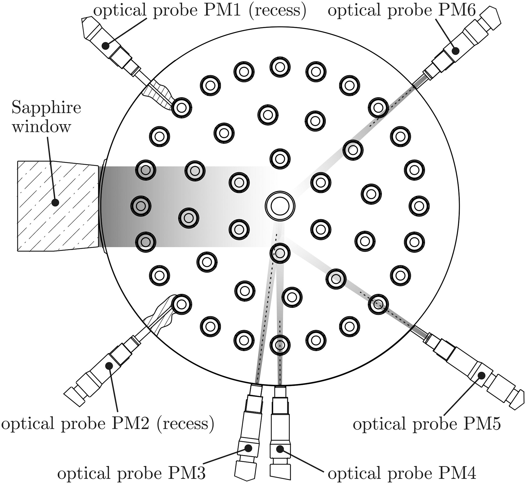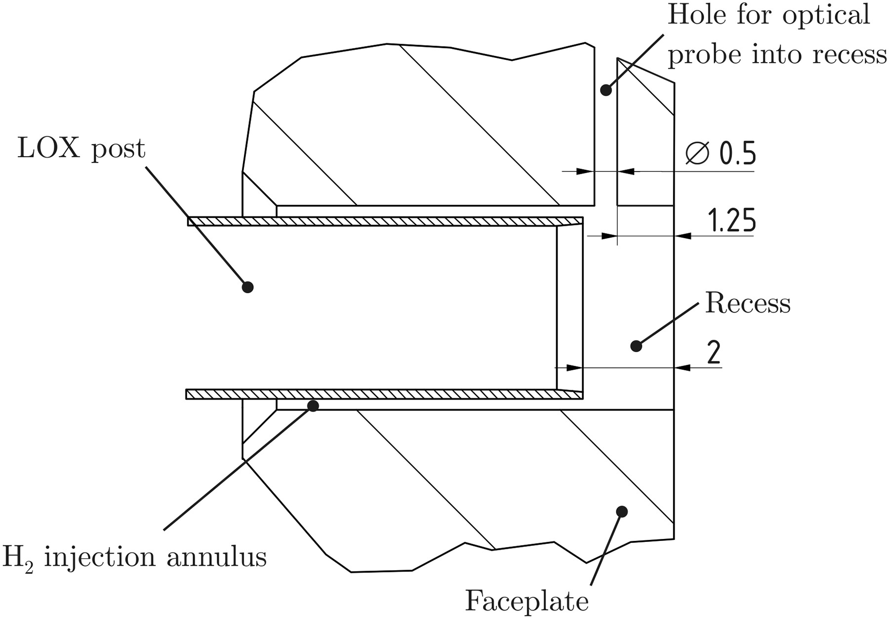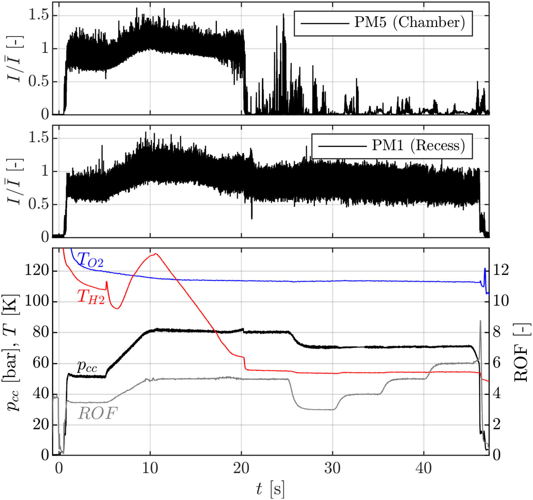 Figure 11 the OH* signal of an optical probe from the recess volume at the position PM1 can be seen. This signal does not stop at 20 s, but continues to record significant OH* emission intensities until the combustion chamber is shut off. The results therefore represent strong evidence that the flames anchor consistently at the LOX post even in the presence of cold hydrogen. This is consistent with Gröning’s conclusion,