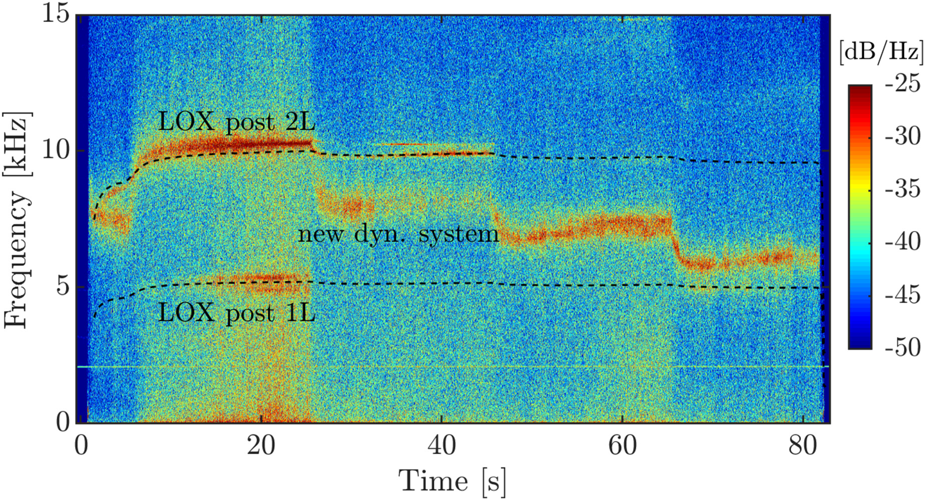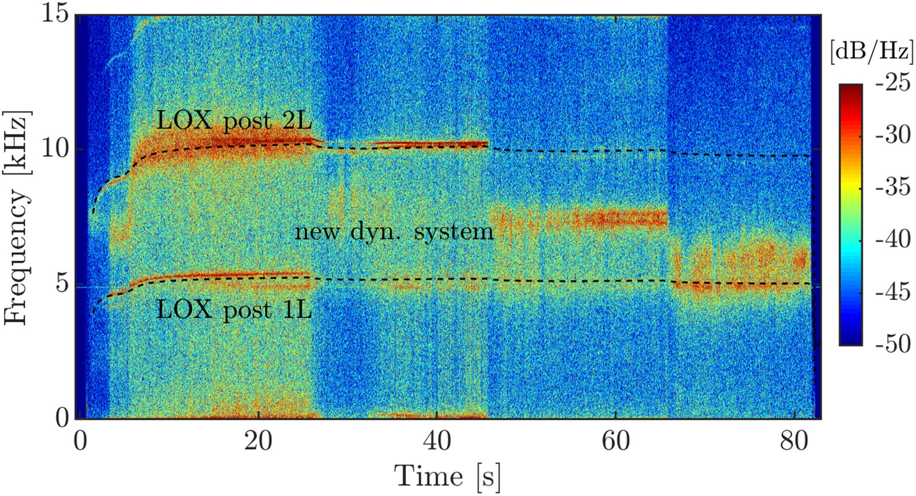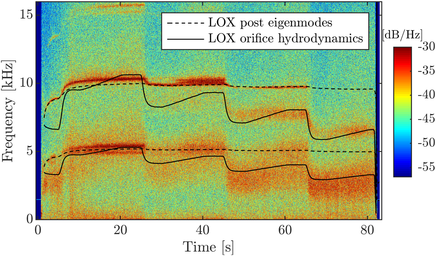 24Figure 17 shows a spectrogram of the OH* oscillations measured through a fibre-optical probe in the measurement plane during the ROF-ramping test run. Overlaid are the first two LOX post eigenmodes via the dashed lines. In addition, the calculated whistling frequencies for
