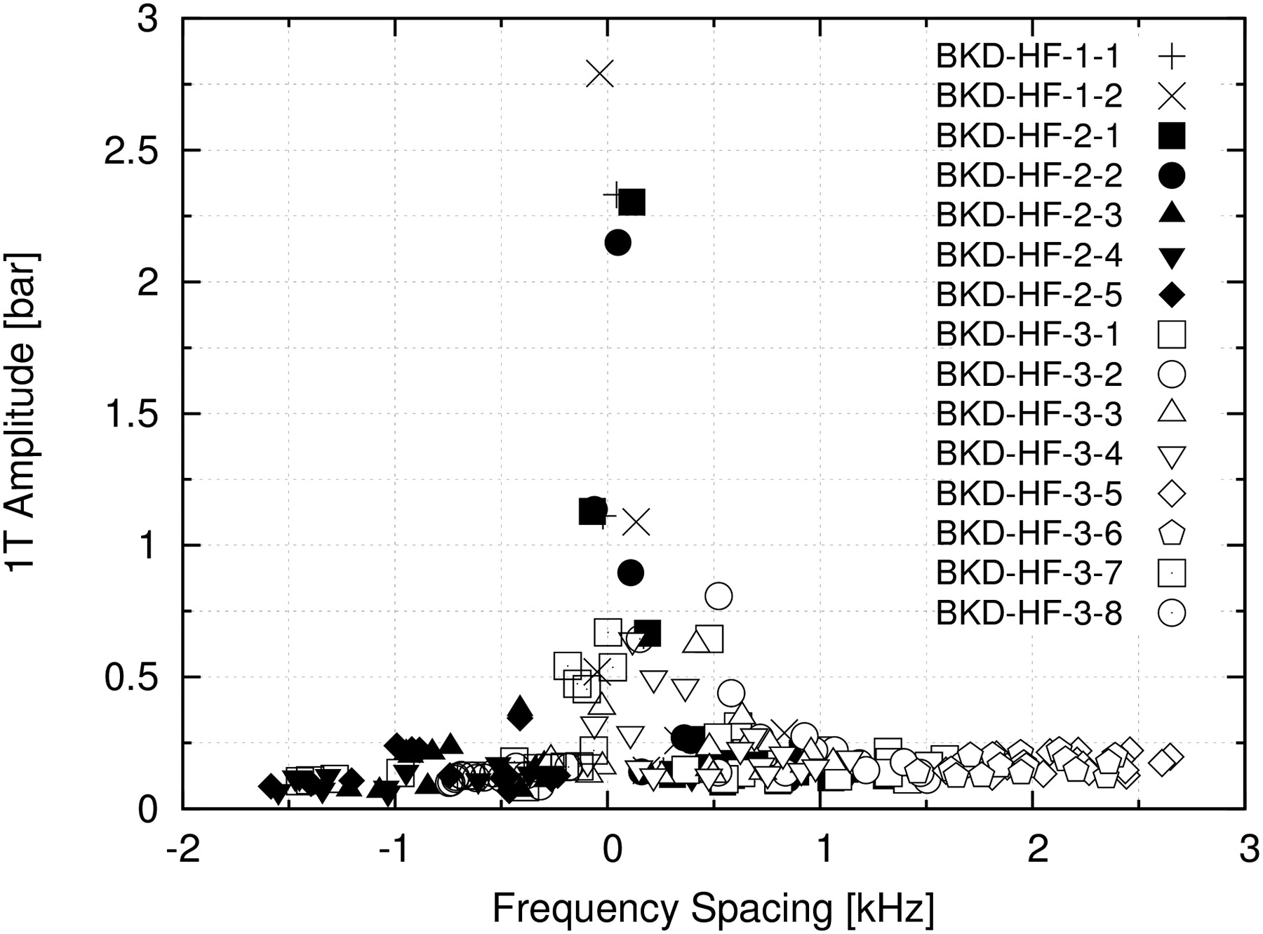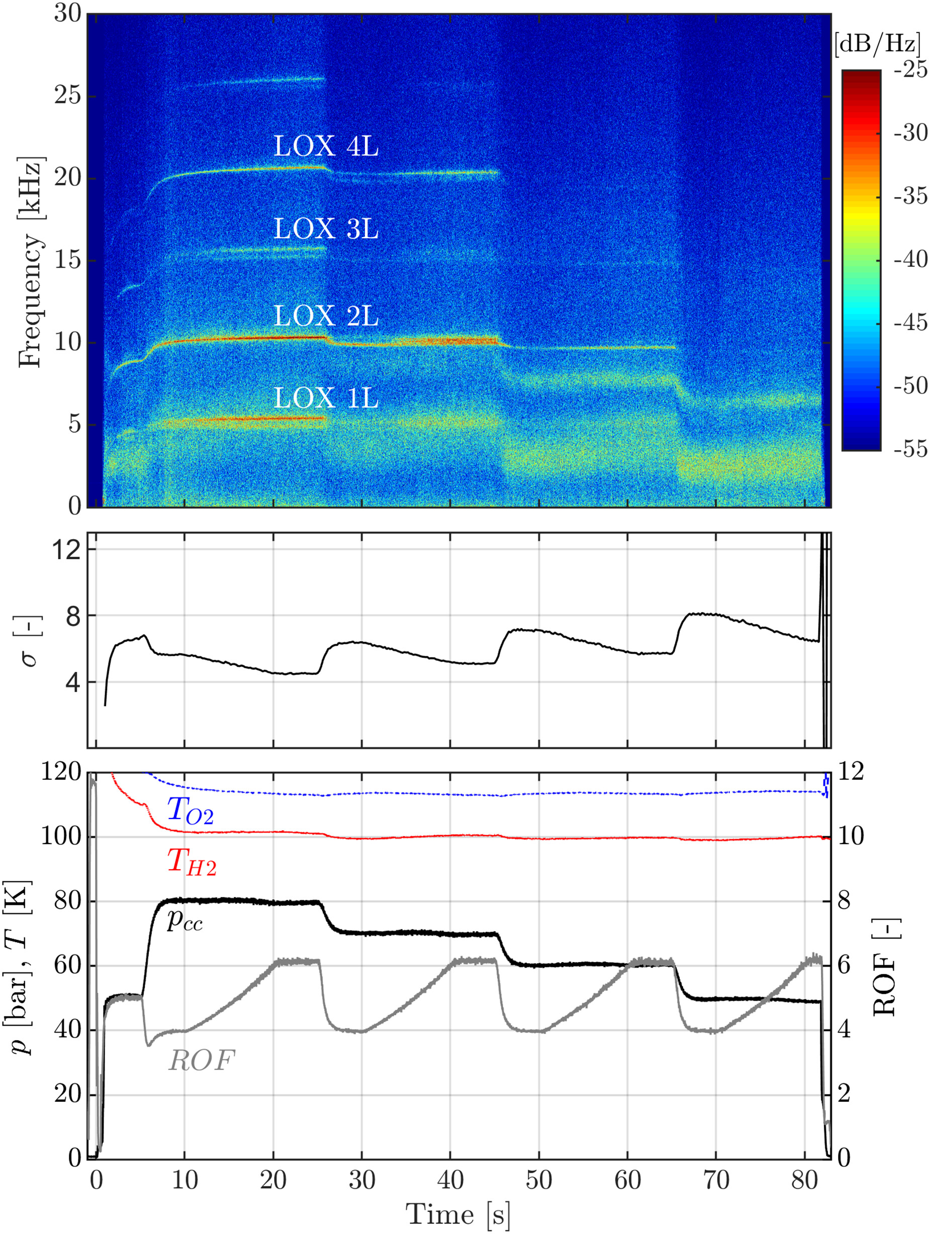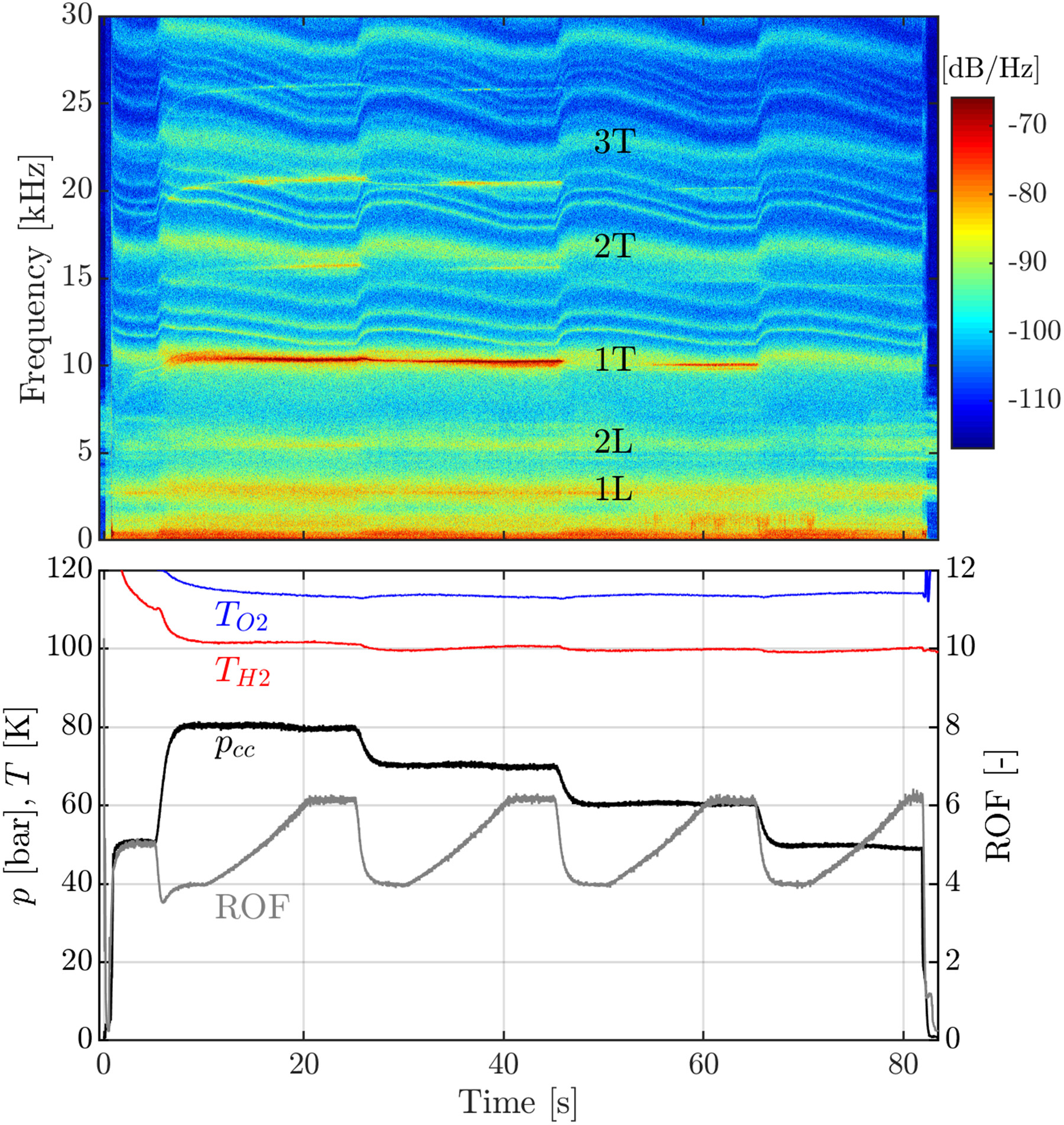 As can be seen in the two diagrams, the load points at different combustor pressures have a comparable, relative combustion noise level. This can be seen in the curve of the PSDs up to the first combustion chamber mode (1L at about 2.5 kHz) and also in the frequency intervals between the combustion chamber modes. Apart from the 1T mode at 10 kHz, which is known to be unstable for bar and ROF 6, the stable combustion chamber modes, which are excited by the broadband combustion noise, also have comparable peak heights. No significant difference in relative combustion chamber noise is seen between different combustion chamber pressures. However, if combustion noise were the excitation source of the LOX-post-acoustics, the noise intensity should differ significantly between higher combustor pressures (70–80 bar) and lower combustor pressures (50–60 bar). Therefore, the turbulent combustion noise cannot be the sole source of excitation of the LOX posts.