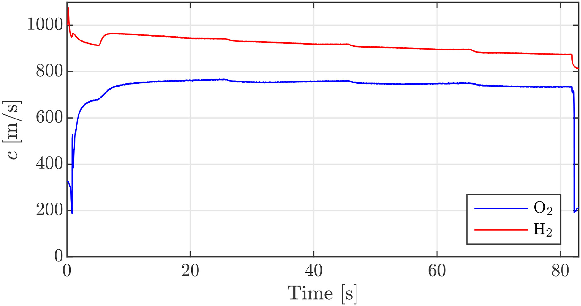 Figure 14 shows the temporal behaviour of the speed of sound of the propellants in the injector head. Since in the investigated test run, the propellant temperatures are kept almost constant, the speed of sound in the injection system doesn’t show large variation. When steady state conditions are achieved at about 5 s both