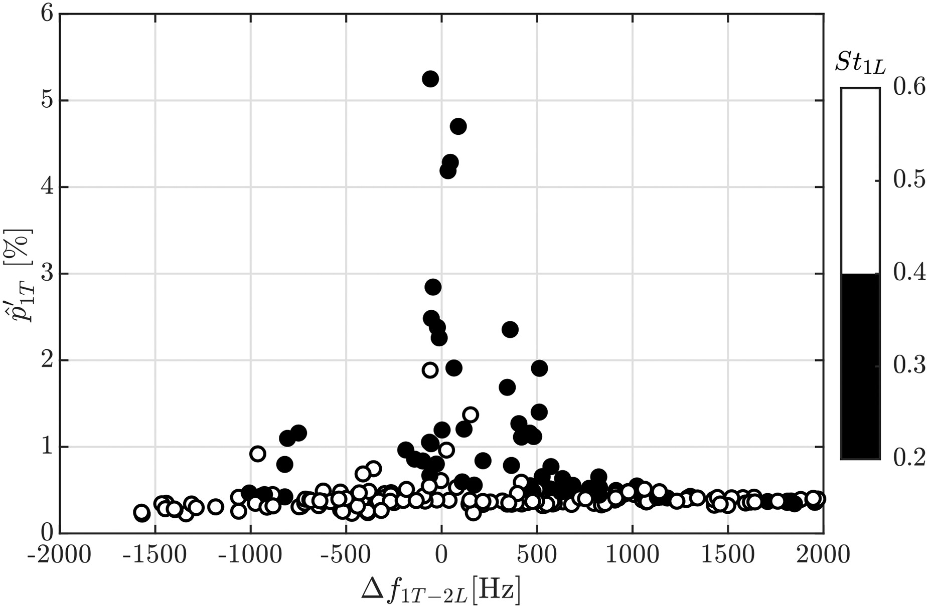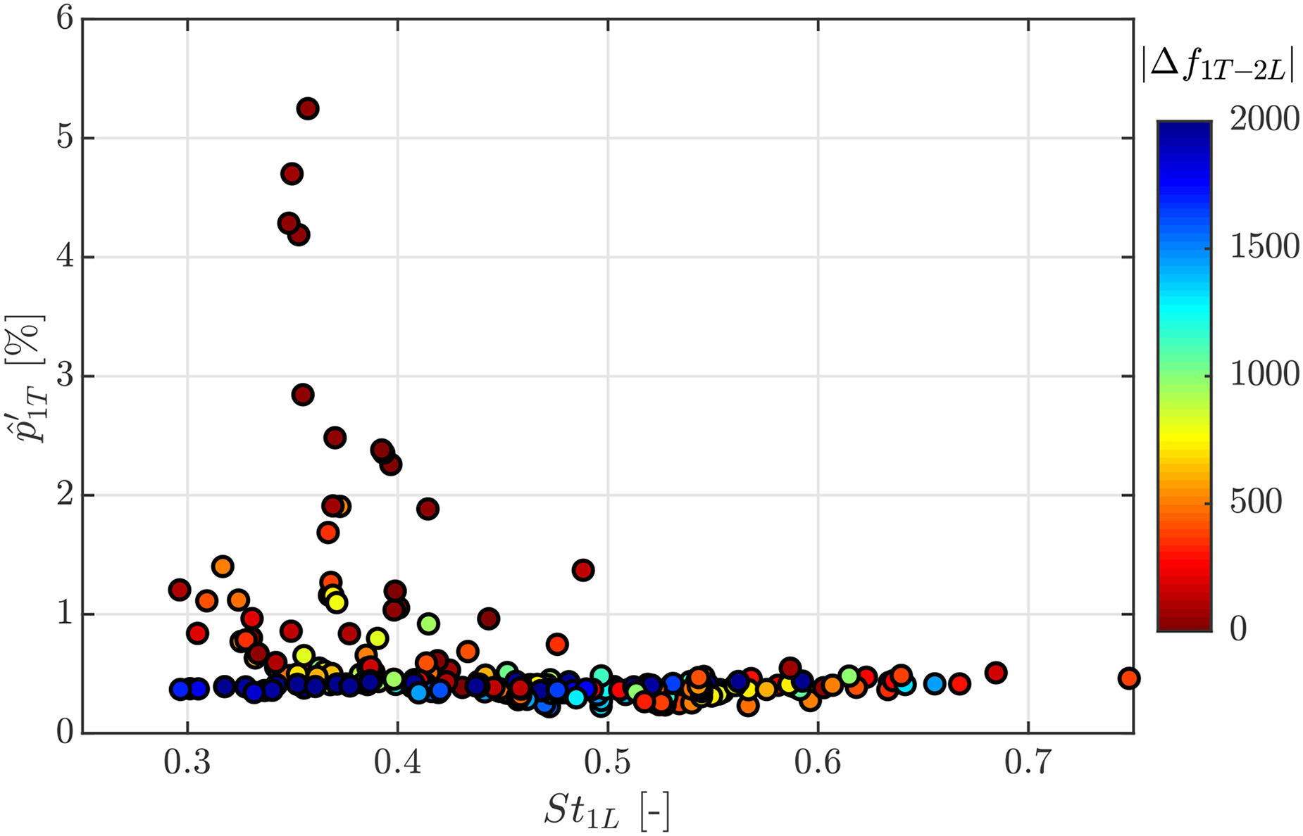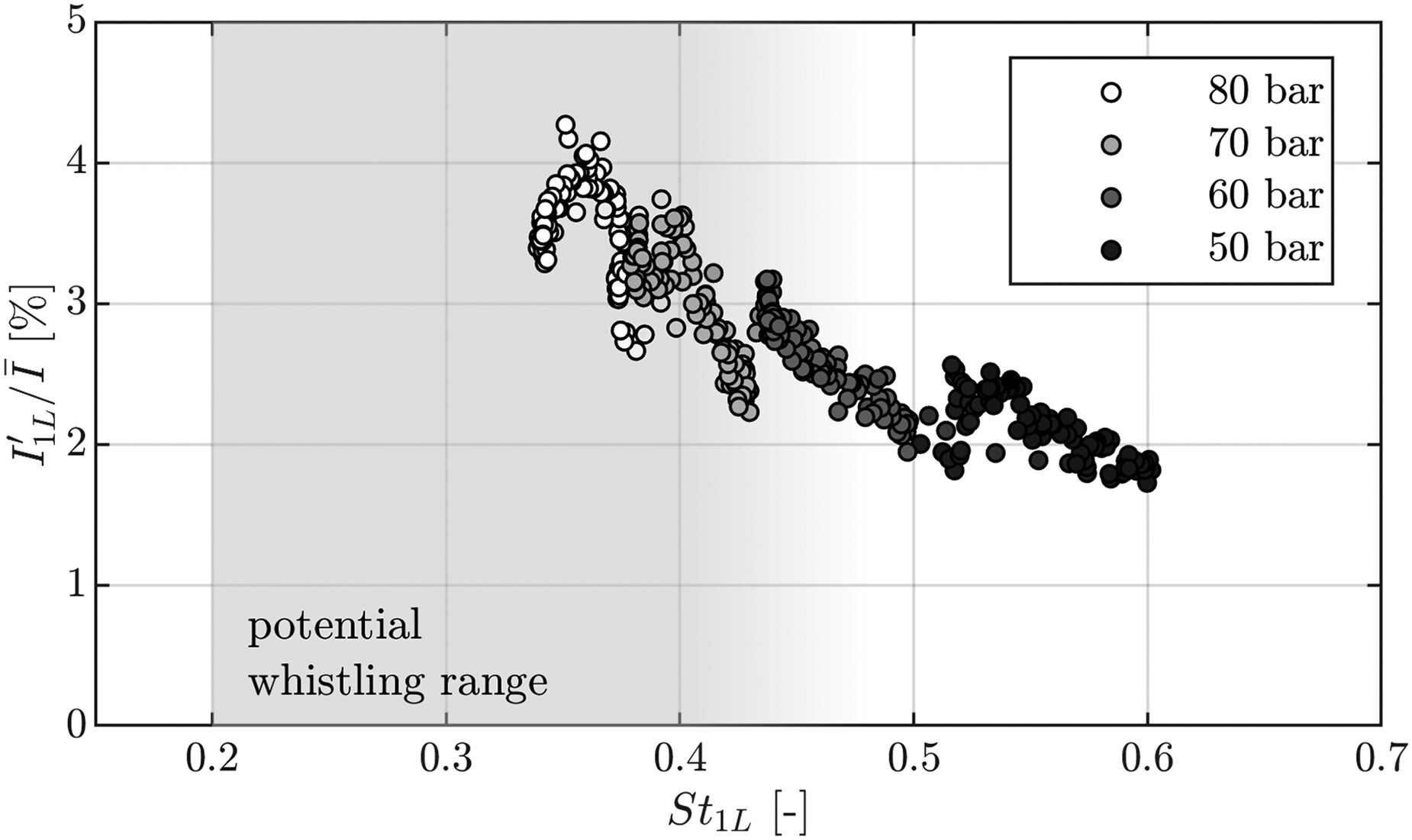 22,23,40,41,44,43,42,45 It can be observed that the highest oscillation amplitudes with the LOX post 1L mode appears for Strouhal numbers around 0.35. For Strouhal numbers above the typical whistling range, the OH* oscillations are weaker, thus indicating that the LOX post acoustics are amplified by a hydrodynamic effect.