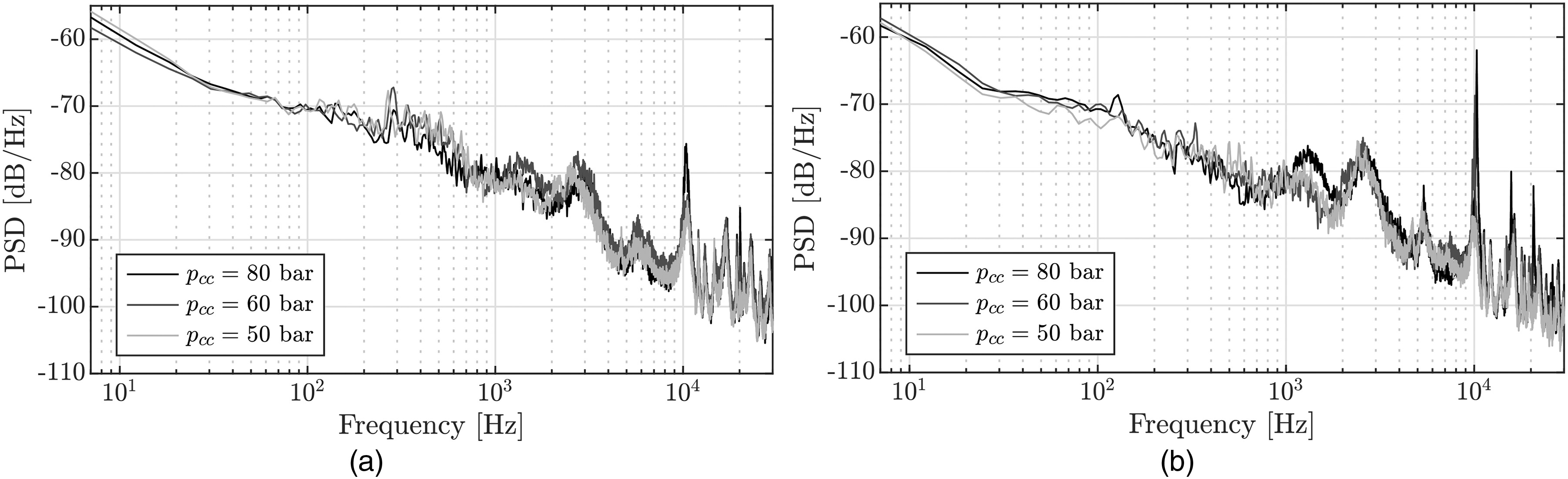 Figure 9 compares the relative noise intensity in BKD for different operating conditions. In the power spectral density (PSD) calculation, the respective mean combustion chamber pressure was used for the dB-scaling.