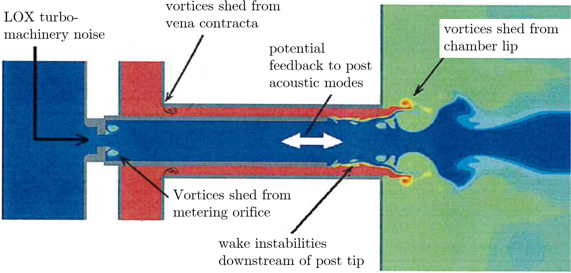 47 mentioned unexpected vortical structures downstream of the LOX injector orifice and that they could interact with the LOX post resonant modes in BKD. Another numerical study of the LOX injector flow of BKD also showed that vortical structures appear in and downstream of the orifice and are able to excite the acoustic resonant modes of the post without any additional external forcing.