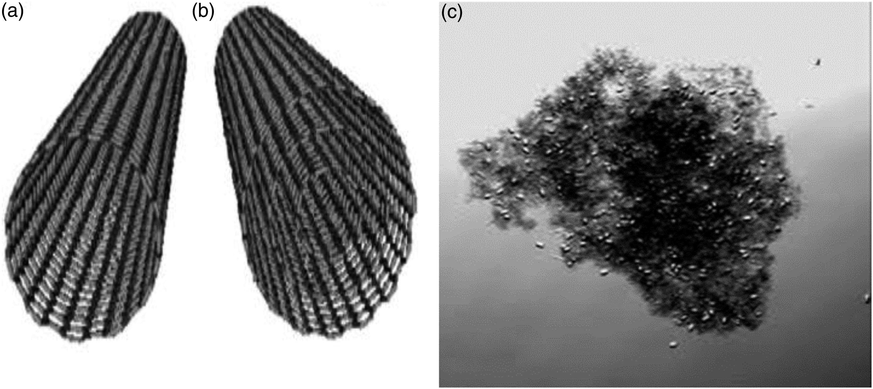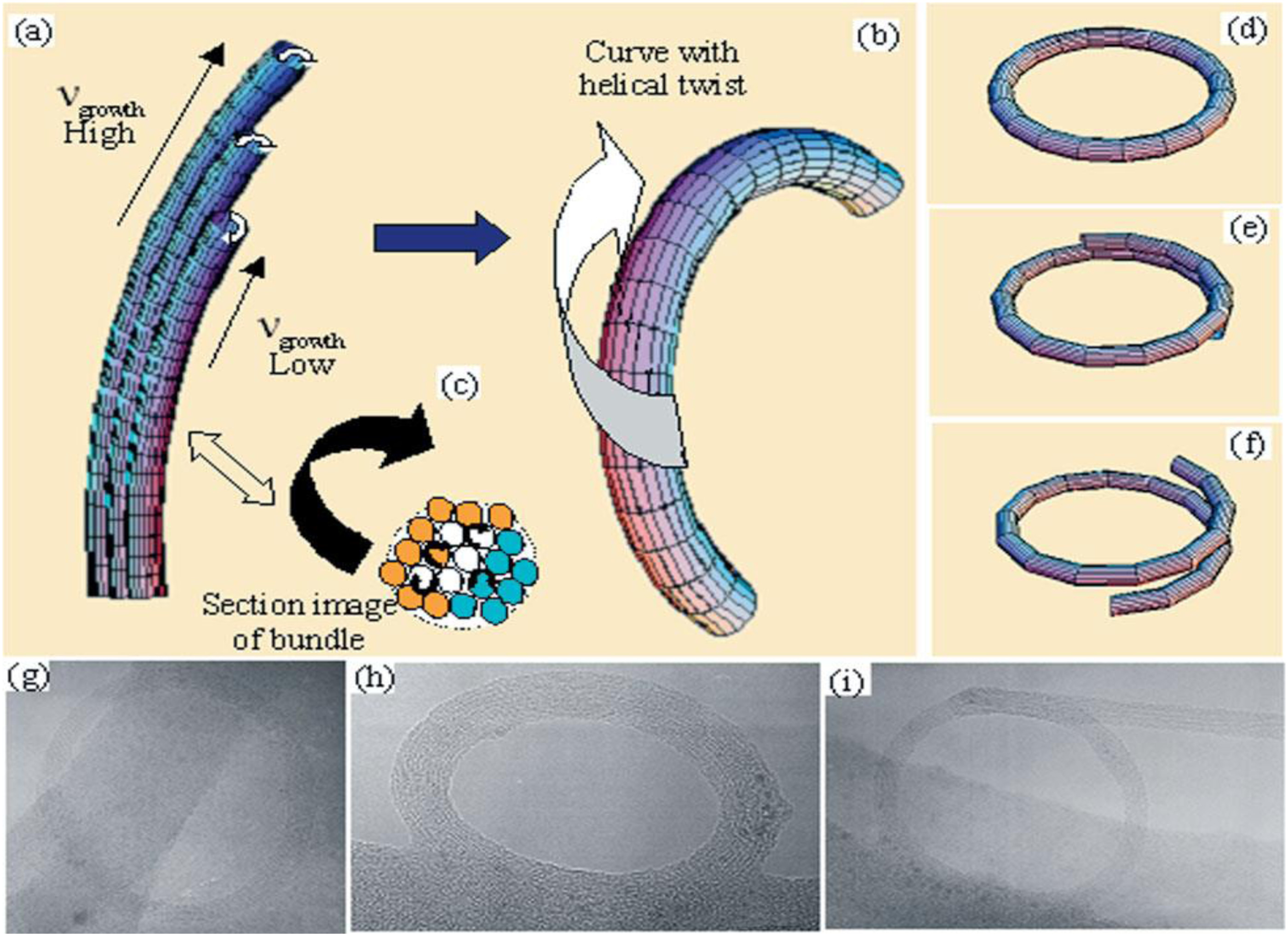 Figure 12. Schematic representation of the growth mechanism of carbon rings. The cylinder corresponds to a SWNT bundle. a, b) The bundles are induced to twist and bend by the varying growth stress for different nanotubes and due to the tube–tube interactions. c) Schematic representation of a cross section of SWNT bundles showing the varying growth rates of the nanotubes and the SWNTs twisting against one another. d–f) Possible shapes of bundles resulting from the curling process, compared with g–i) TEM images of SWNT rings observed in the experiments (Song. et. al., (2006)).19