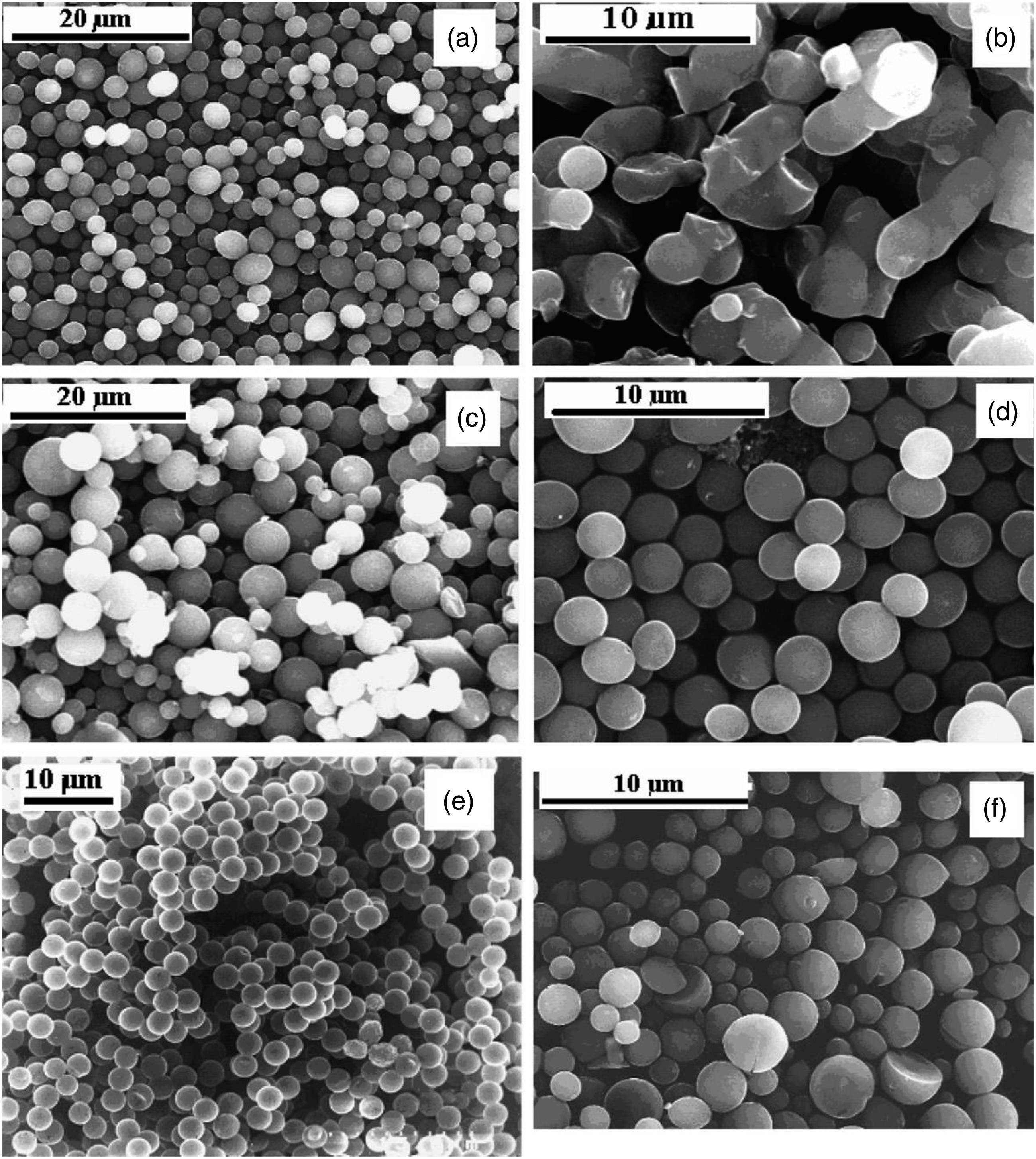 Figure 15. SEM image of (a) pentane, (b) cyclohexane, (c) camphorquinone, (d) xylene, (e) mesitylene, and (f) camphene (Pol. et. al., (2006)).65