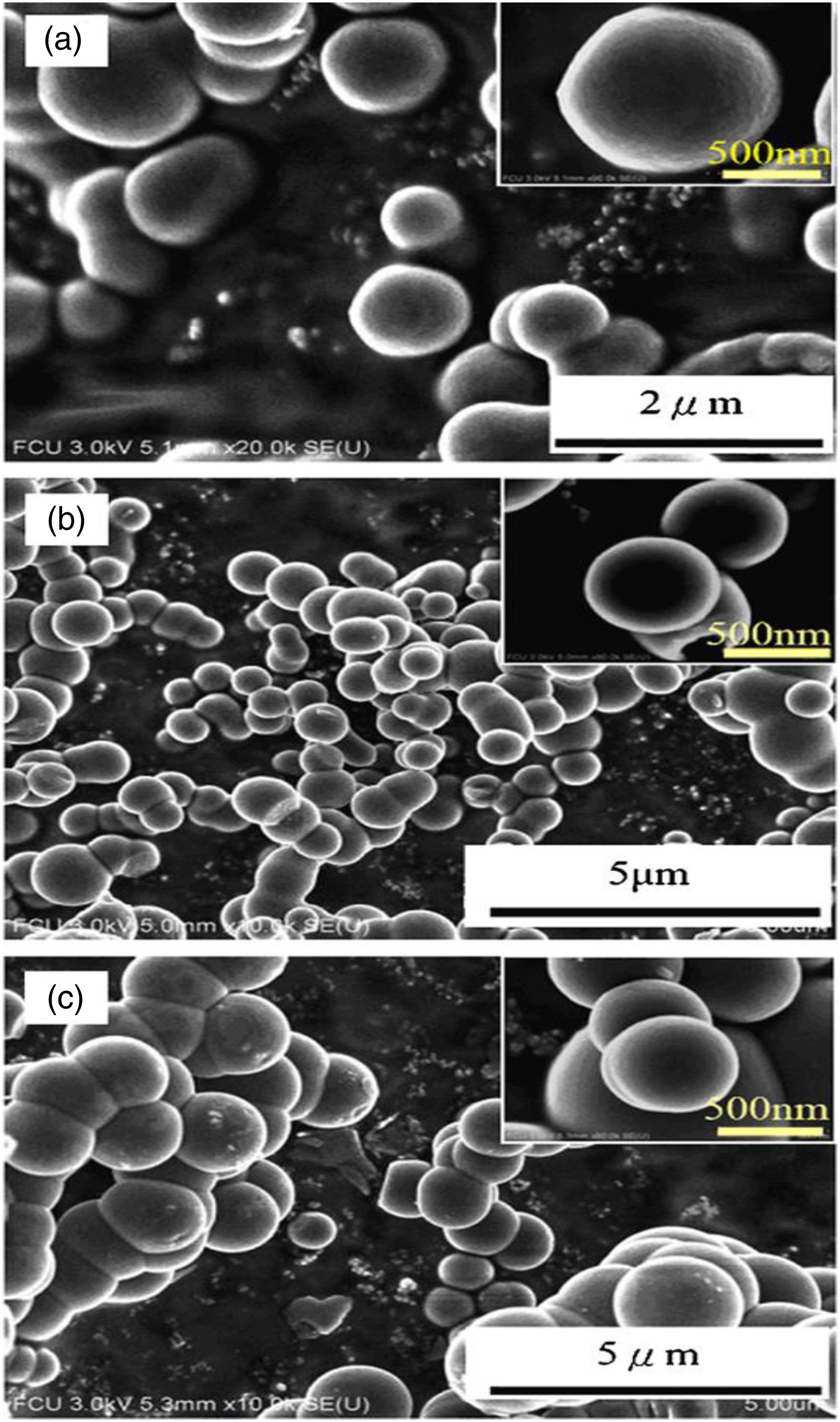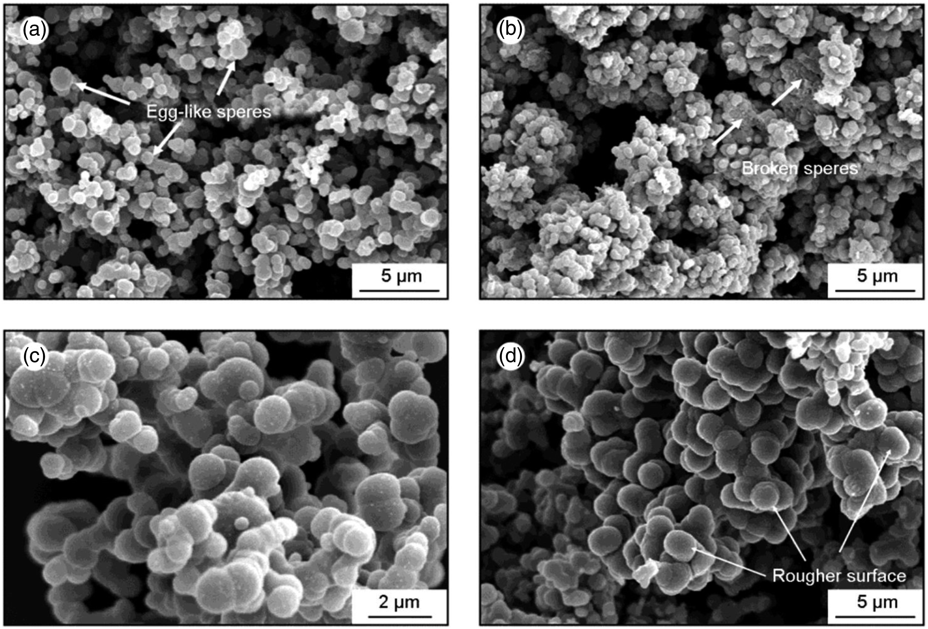 Zhang. et. al. (2016)20 synthesized CNSs by non-catalytic chemical vapor deposition of natural gas/hydrogen mixtures. Author varied the deposition temperature from 1070 to 1200°C, the deposition temperature showed no significant effect on the sphere size and structure. The author revealed that with the increase of deposition pressure, the chance of collision of carbon sphere nuclei was increased. Hydrogen was likely to adsorb to the surface of carbon sphere nuclei and reduce the collision probability of carbon sphere nuclei. It was revealed that carbon nanospheres (50–100 nm) could be produced at 1150°C and 5 kPa with a gas mixture of natural gas/H2=1/4.