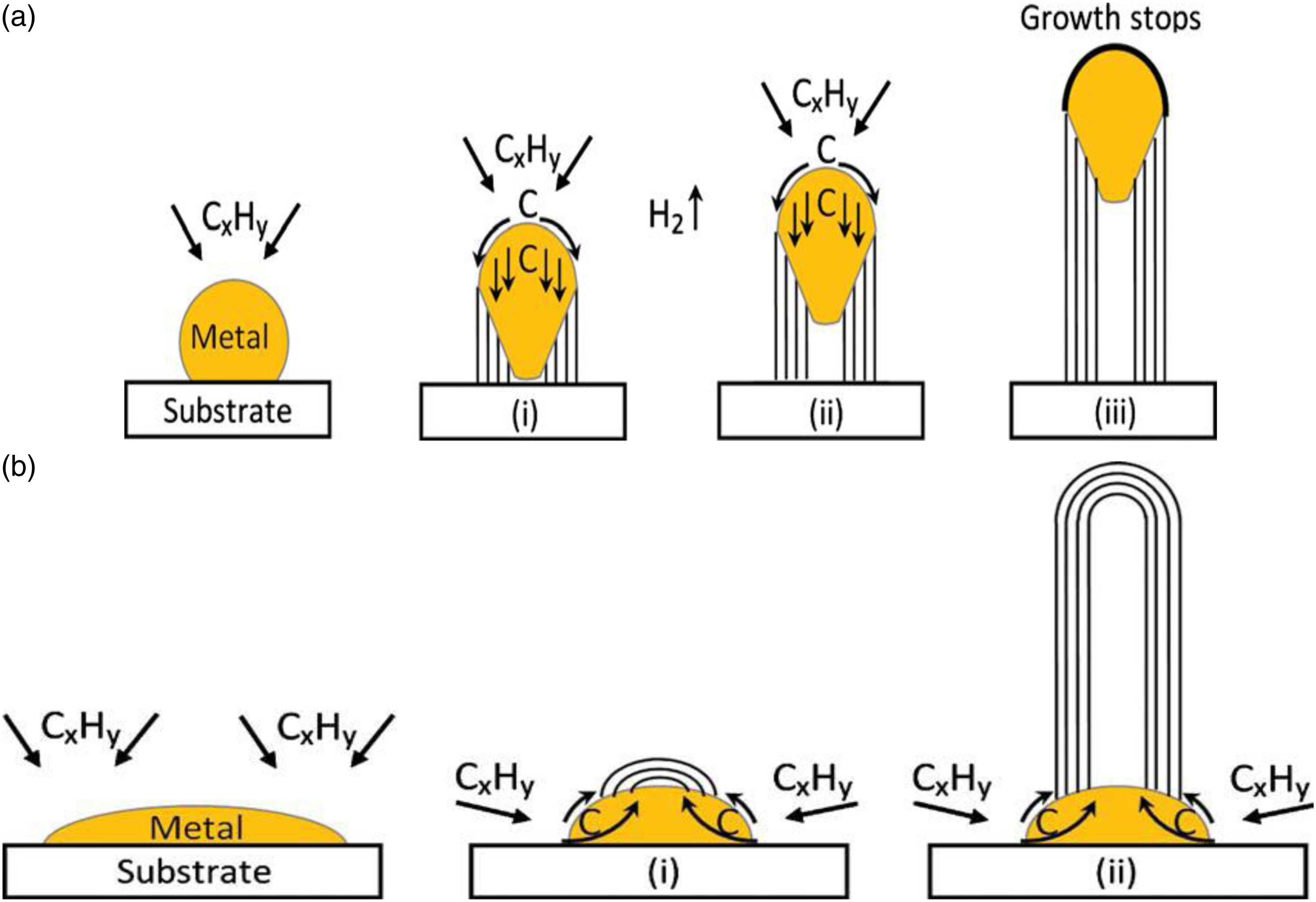 Figure 5. The growth mechanisms for CNTs: (a) tip-growth model, (b) base growth model44.