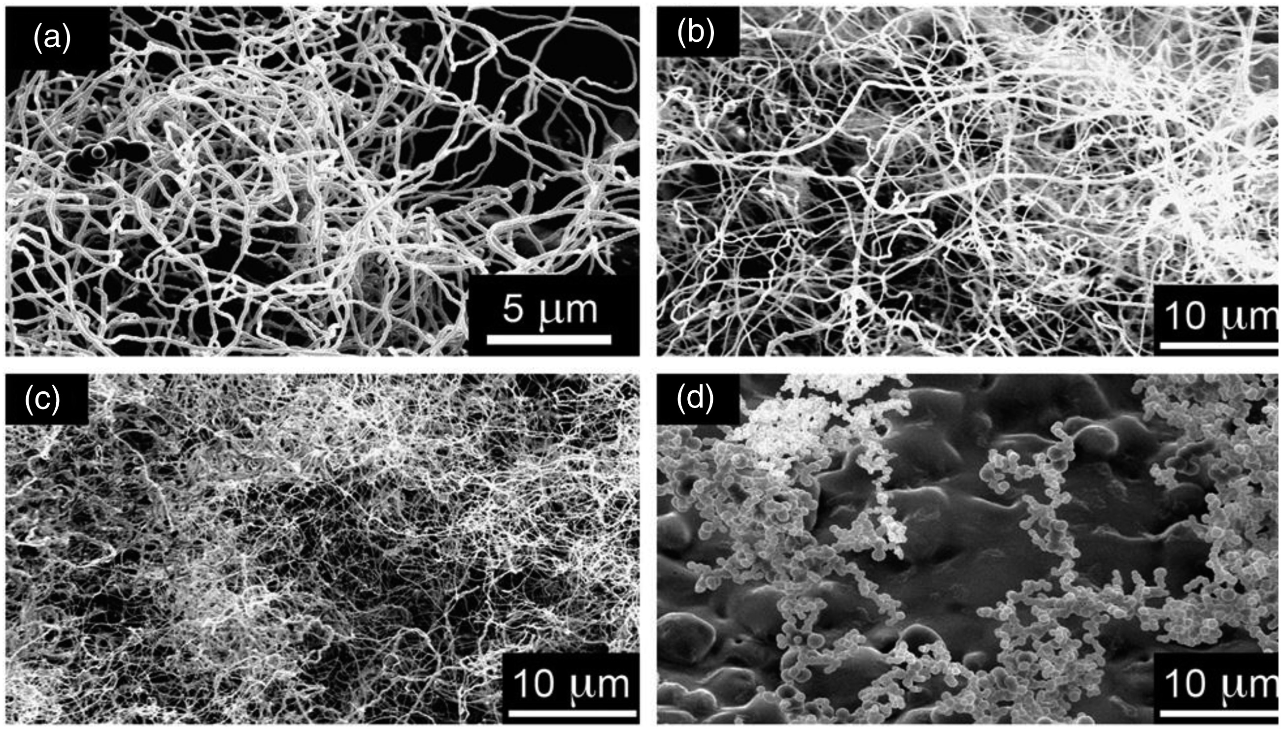 Figure 6. SEM images of the CNTs grown using different nickel film thicknesses using methane as the carbon source: (a) 20 nm, (b) 30 nm, (c) 45 nm, and (d) 60 nm. Atthipalli et al 2011 31.