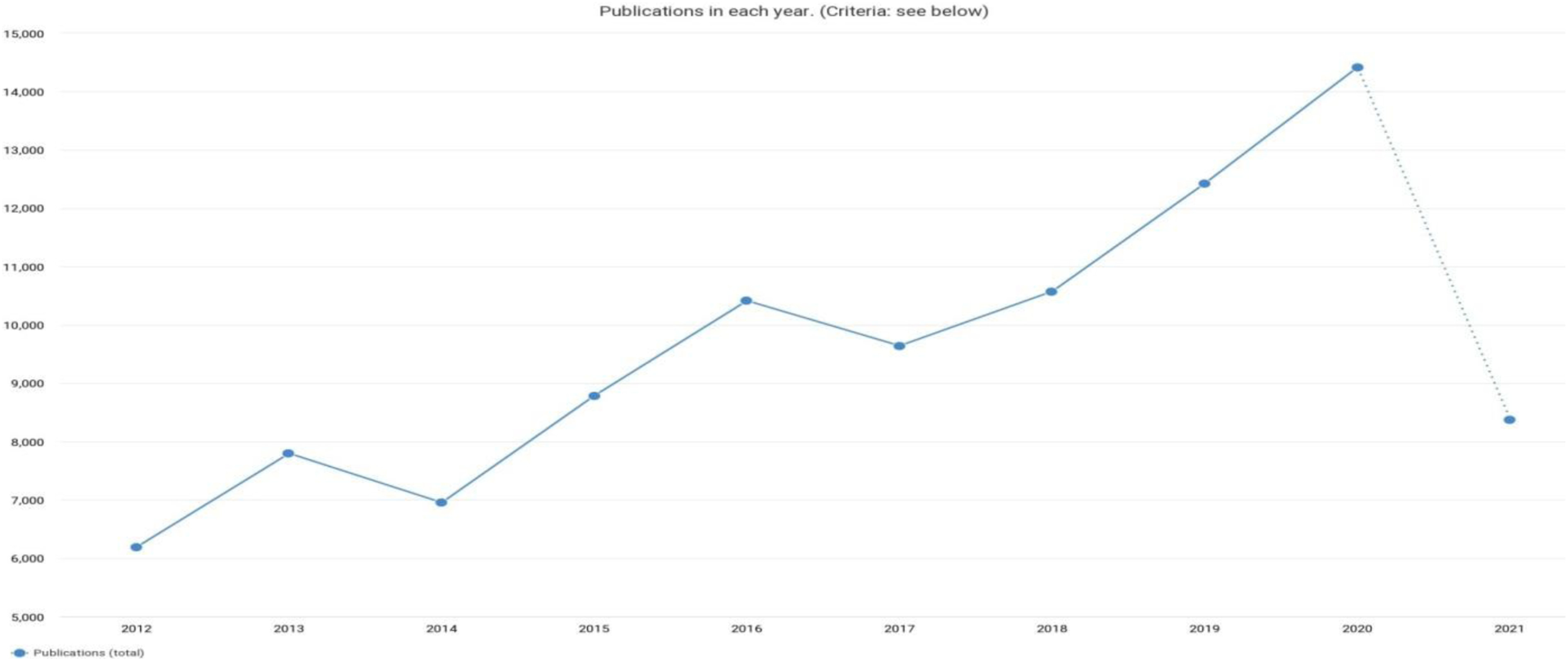 Figure 14 shows the schematic representation of articles published in CNRs from the year 2012 to 2020. The data are obtained from the diemensions.ai. From Figure 14, it was clearly understood that the articles published in CNTs synthesis were drops after the year 2016. Also, Table 5 shows the top 10 researchers who published articles in CNRs synthesis for the past decade. Table 5 is composed of the name of the researcher and their respective affiliation, the number of publications, citations, and citation mean.