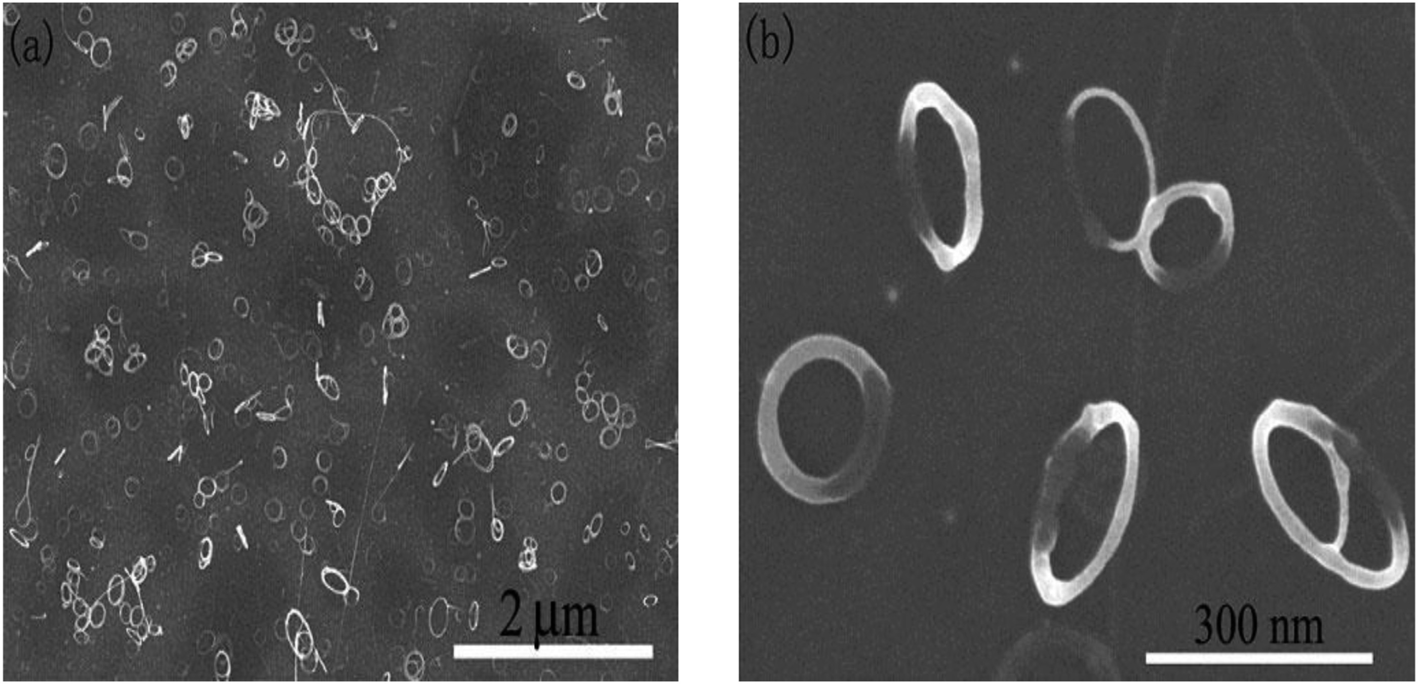 Figure 2. a) Low; b) high-magnification SEM images of SWNT rings deposited on a silicon substrate Song et al. (2006).19