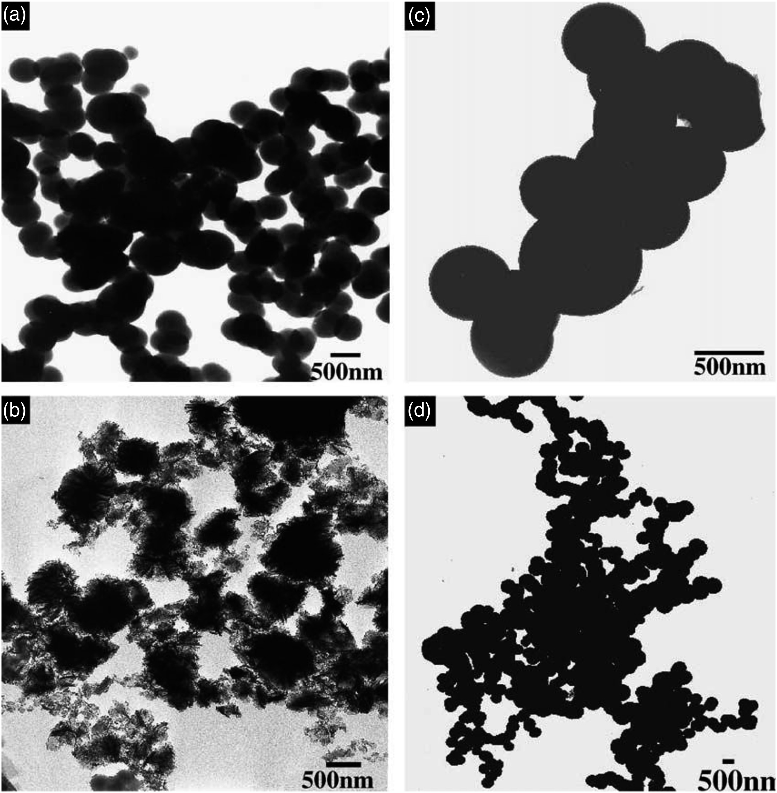 Figure 17. TEM images of the carbon spheres treated by different chemicals: (a) carbon spheres in HF (48%) solution for 48 h at 25°C, (b) carbon spheres in KMnO4 (Hþ) solution for 2 h at 80°C, (c) in CS2 for 10 h and (d) in 1-methyl-naphthalene for 10 h (Miao. et. al., (2004)).66