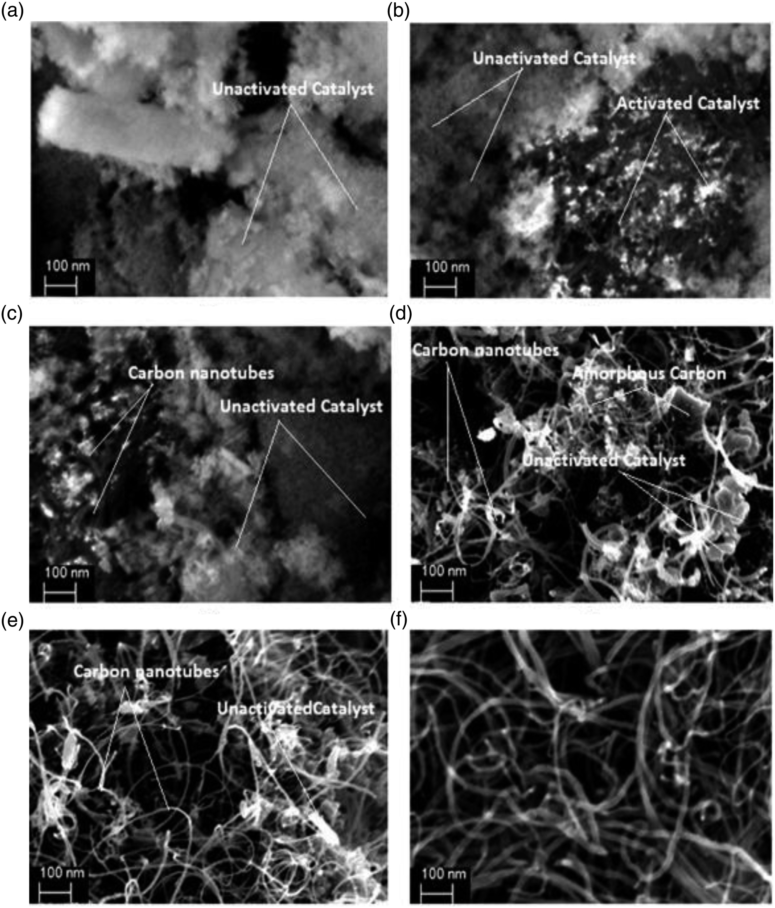 Shukrullah et al. (2015)46 conducted a systematic study on the optimization of the CVD process parameters to study the diameter distribution of the MWCNTs grown on Fe2O3/Al2O3 catalyst support at a fixed temperature of 800°C. FESEM and TEM techniques were used to quantify the influence of the flow rate of ethylene and the CVD process time in the CNT growth parameters. At a critical ethylene flow rate of 100 sccm and a CVD treatment time of 60 min, these studies observed dense and uniform growth of relatively pure nanotubes with a longer tube length and a narrow diameter distribution (see Figure 8).