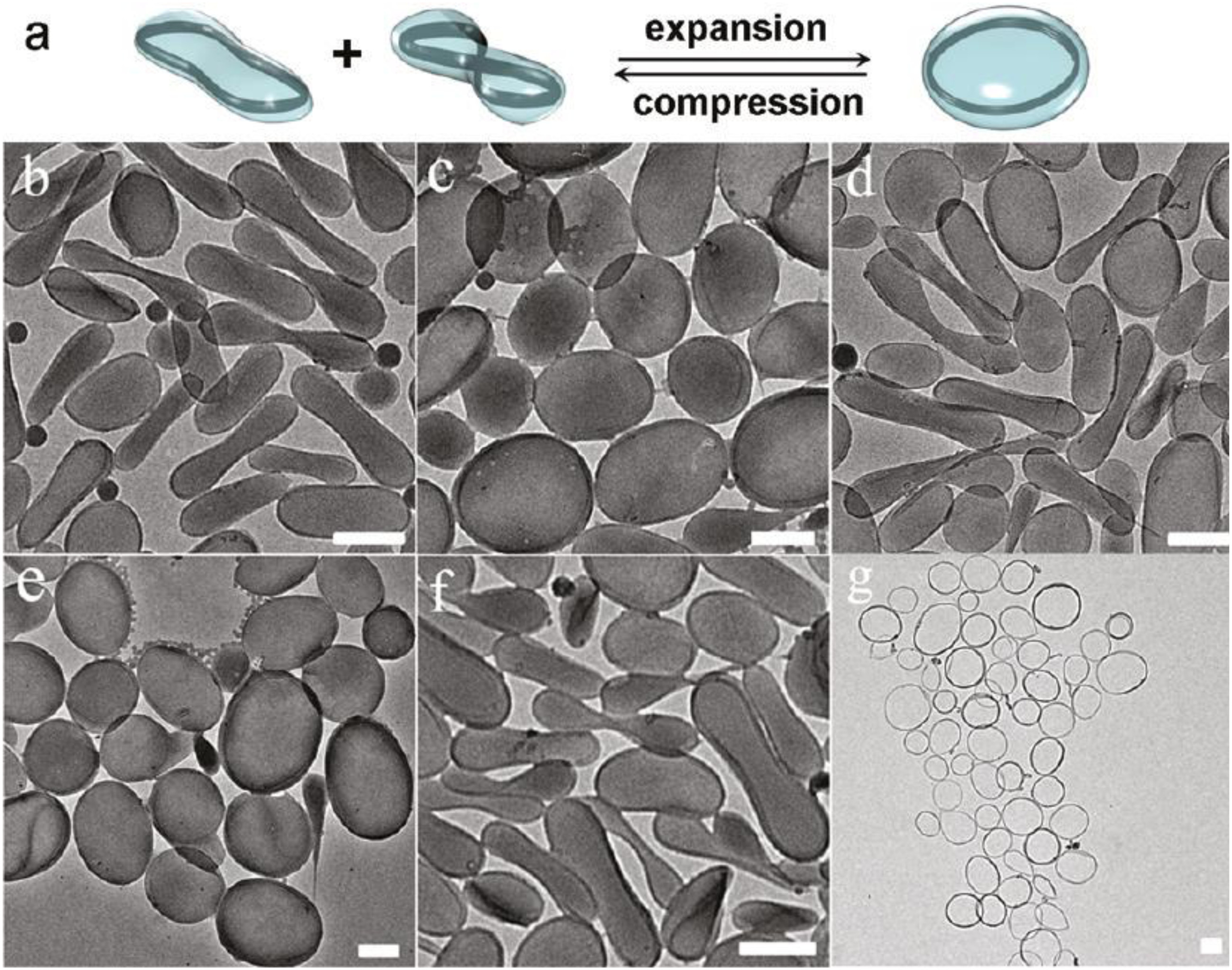 Figure 13. (a) Schematic representation and (b to g) TEM images of carbon nanorings undergoing five consecutive steps of structural transformation. Compressed rings (b) were expanded to circular rings (c) by moderate swelling of their shells. They were compressed again (d), expanded again (e), compressed again (f), and then finally expanded by dissolving away their polymer shells (g). All scale bars represent 200 nm (Cheng. et. al., (2011)).58.