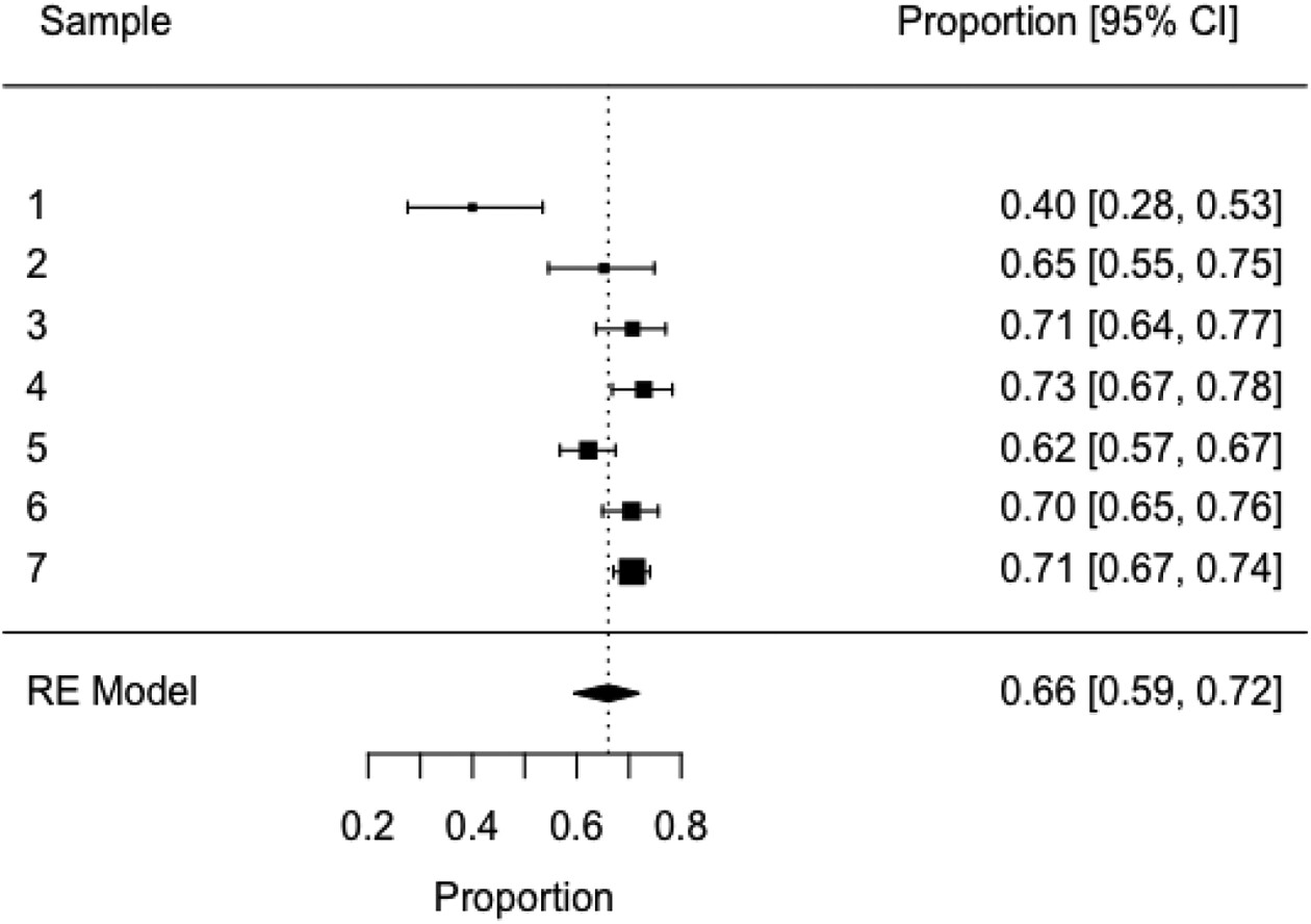 Viechtbauer, 2010; RStudio version 3.6.2) revealed a median proportion of 0.66 (95% confidence interval [CI] = [0.59, 0.72]), and an estimated average log-odds of 0.66 (