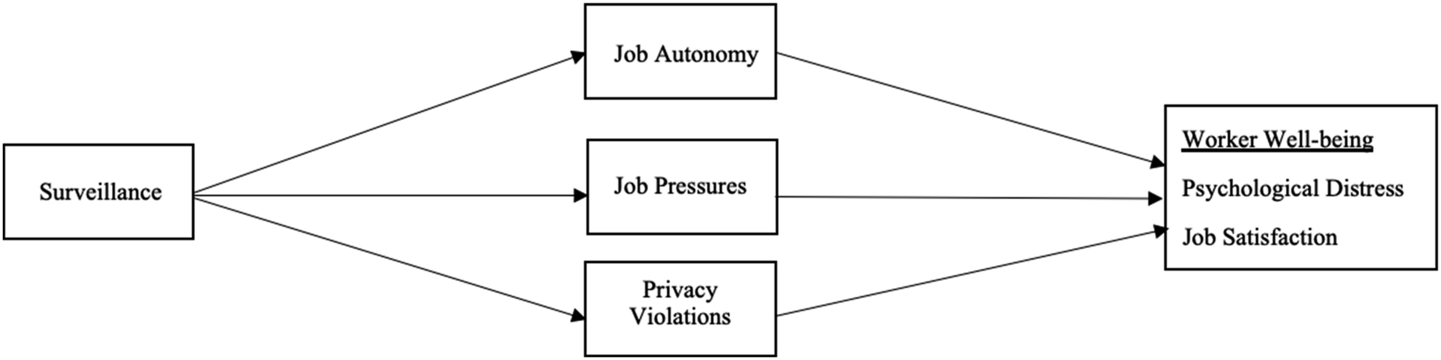 In the current research, we address these gaps by examining the associations between surveillance and psychological distress and job satisfaction in a sample of workers with diverse socio-demographic and occupational characteristics. This sample diversity affords us sufficient variation in workers’ experiences of the hypothesized secondary stressors—including job pressure, autonomy, and privacy violations—that we expect to explain part or all of surveillance’s negative consequences for mental health or job satisfaction. Our decision to examine psychological distress and job satisfaction was motivated by two factors. First, exploring multiple indicators allows for a more comprehensive and nuanced assessment that recognizes the multidimensional nature of well-being (