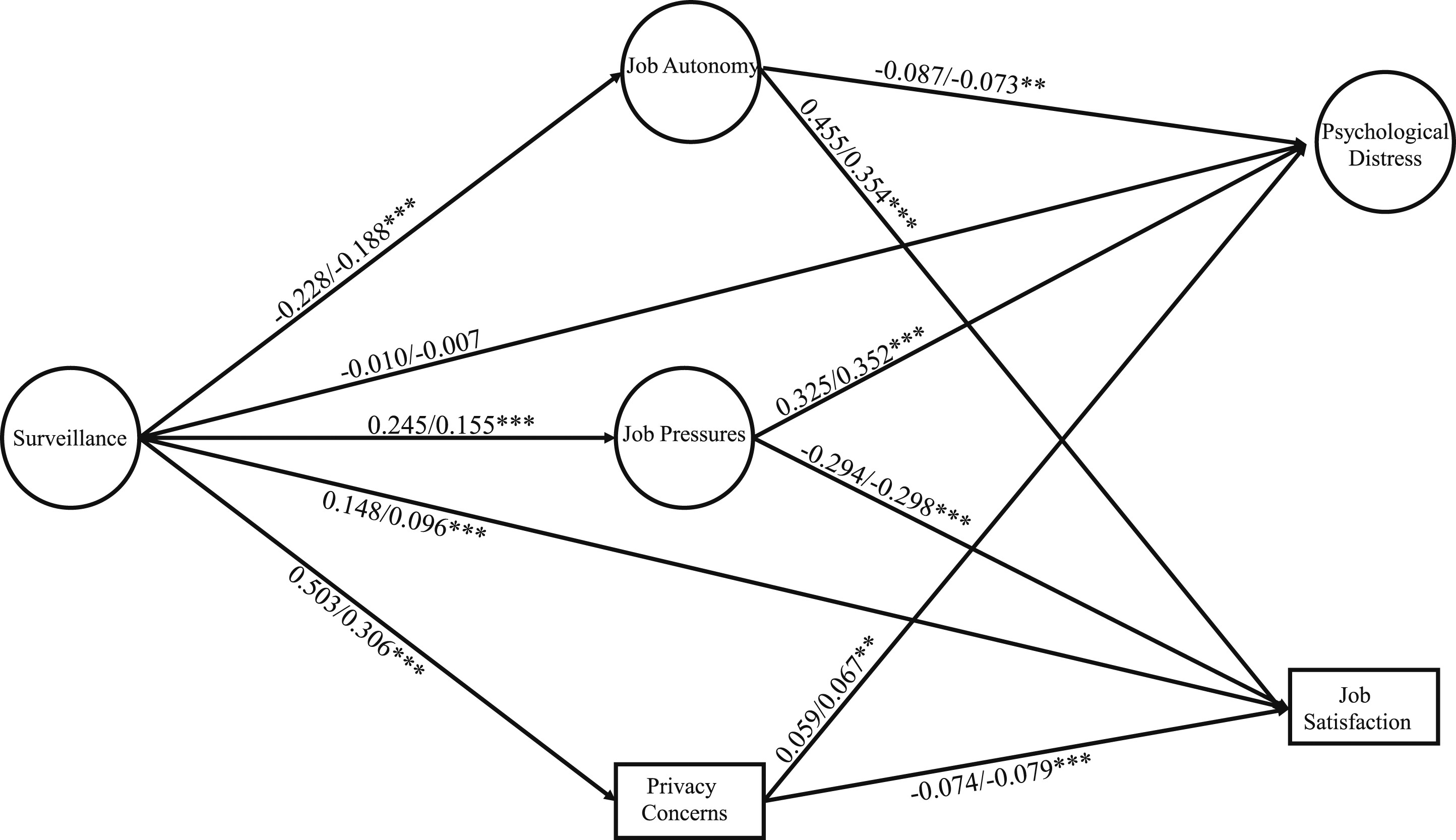 Figure 2 reports the results of an SEM that positions job autonomy, job pressure, and privacy violations as mediators between surveillance and the well-being outcomes, with these associations shown net of individual background covariates. Unstandardized and standardized coefficients are presented. The SEM shows that latent levels of surveillance are significantly associated with lower levels of job autonomy and higher levels of job pressures. Surveillance is also significantly associated with greater levels of privacy violations. The associations between surveillance and autonomy and pressures are of similar magnitude based on the standardized coefficients. Additionally, surveillance is more strongly associated with privacy violations, which is not surprising given the relevance of surveillance to privacy. Each hypothesized mediator is in turn associated with worse well-being outcomes. Job autonomy is significantly associated with lower levels of psychological distress and higher levels of job satisfaction, while both pressures and privacy violations are significantly associated with higher levels of distress and lower levels of job satisfaction. For psychological distress, the strongest predictor of the three is job pressures, whereas job autonomy is the strongest predictor of job satisfaction.