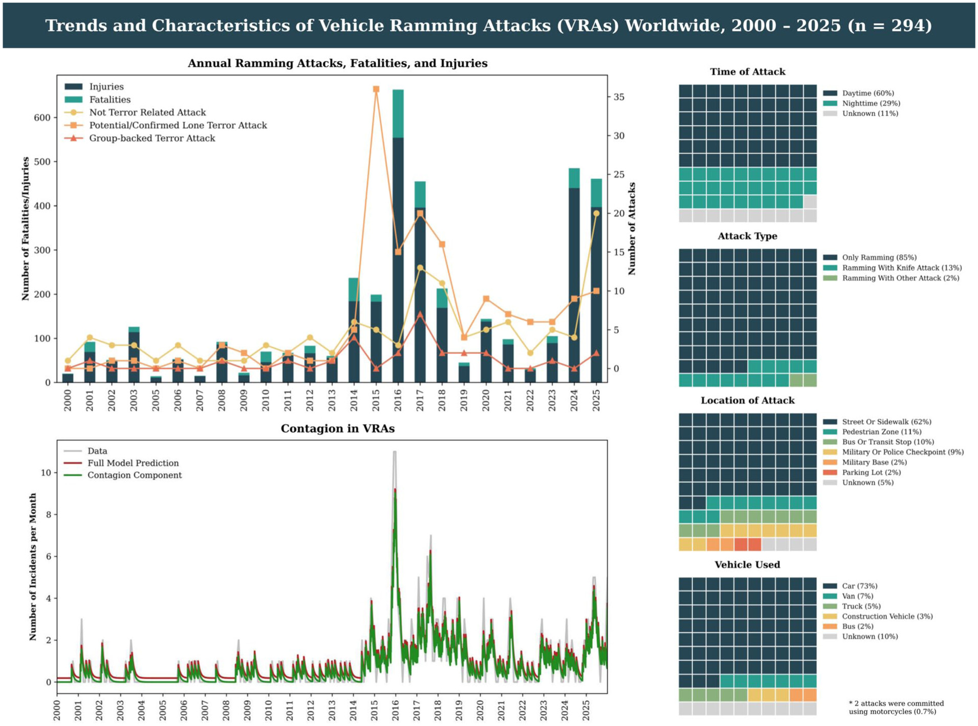 Between 2000 and 2025, there were 294 VRAs worldwide, an average of one attack every 32.3 days. Of these, 113 (38.4 percent) were not terror related, 155 (52.7 percent) were potential or confirmed lone-wolf terror attacks, and 26 (8.8 percent) were group-backed terror attacks. The main chart shows trends in these attacks over time.