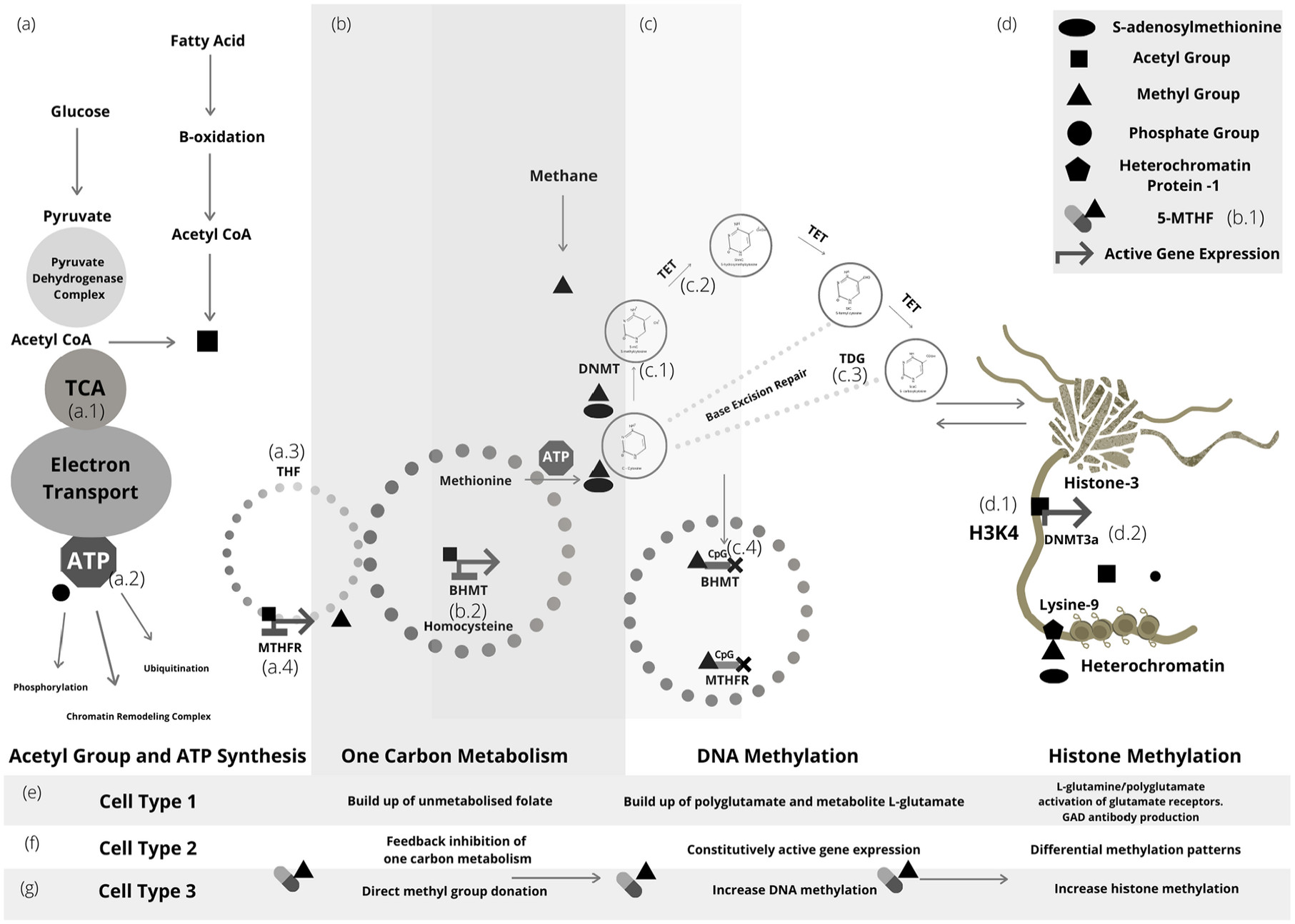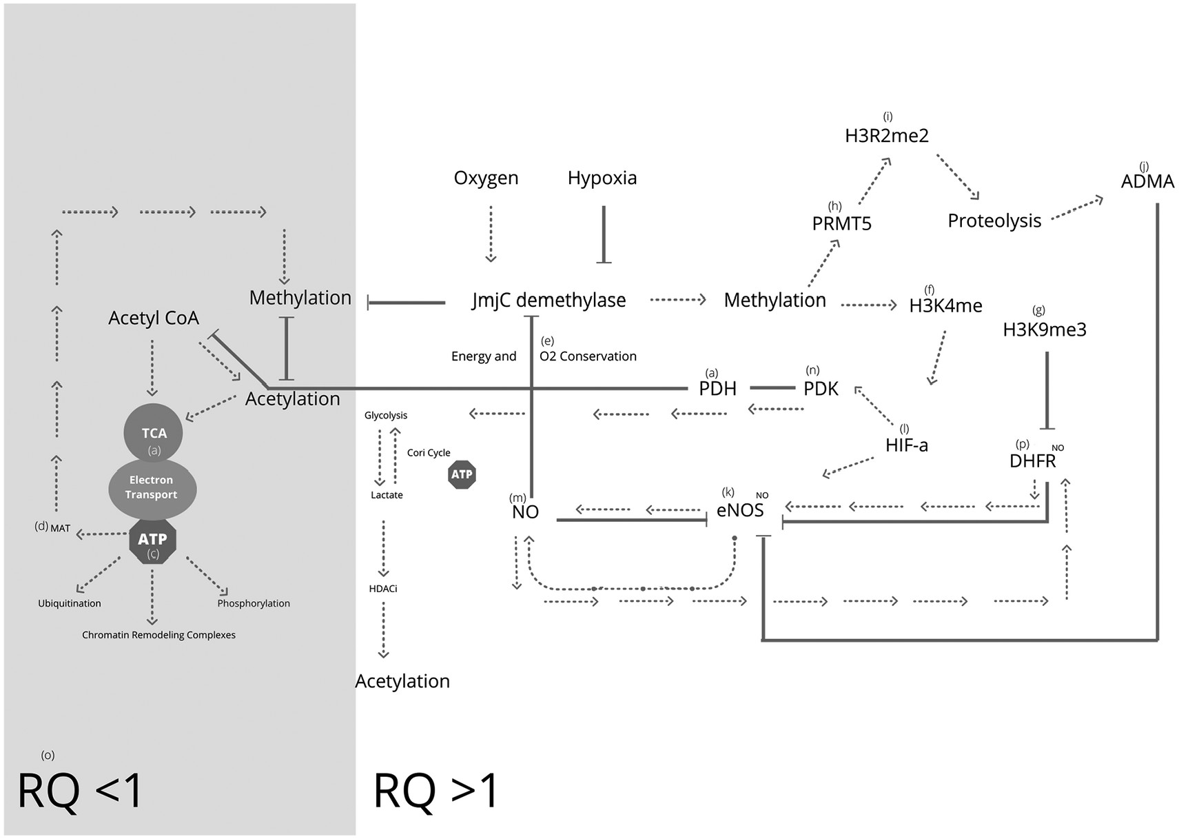 B vitamins have long been associated with energy production; however, the mechanisms have remained undefined. The above describes how a reduction in sustainable ATP synthesis, through hypoxia, or hypermethylation at the level of acetyl CoA synthesis could result in downregulation of all primary ATP dependant epigenetic modifiers, relying on environmental or supplemental direct methyl group donation to drive methylation and glycolysis only metabolism (RQ > 1) which is unlikely to be sustainable for exercise such as endurance. Moreover; TCA cycle or mitochondrial ATP synthesis defects have been repeatedly implicated in diseases of cancer and dysfunctional immunity.