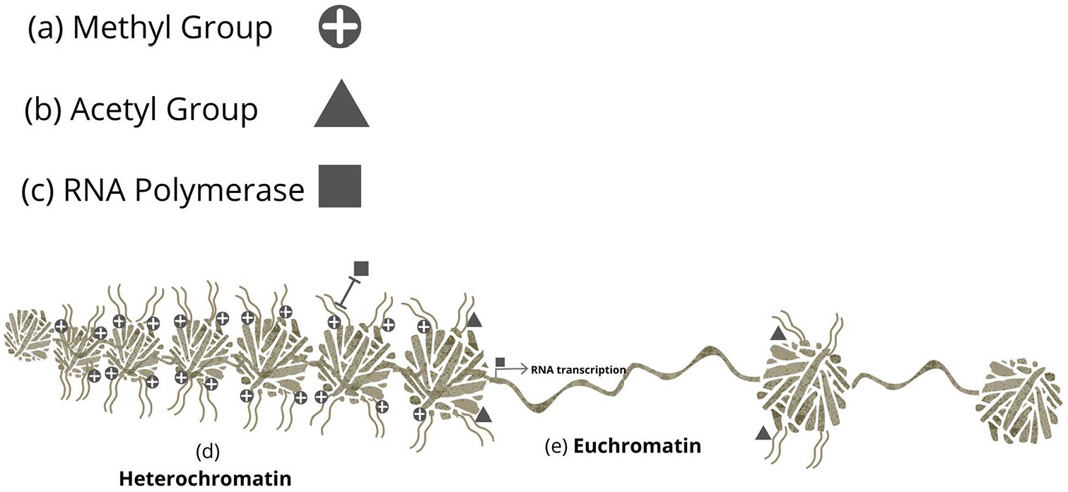 19 Methylation of a repressive histone residue such as histone-3 lysine-9 results in a heterochromatin structural change to the epigenome and the exclusion of RNA polymerase from the genome, preventing gene expression.