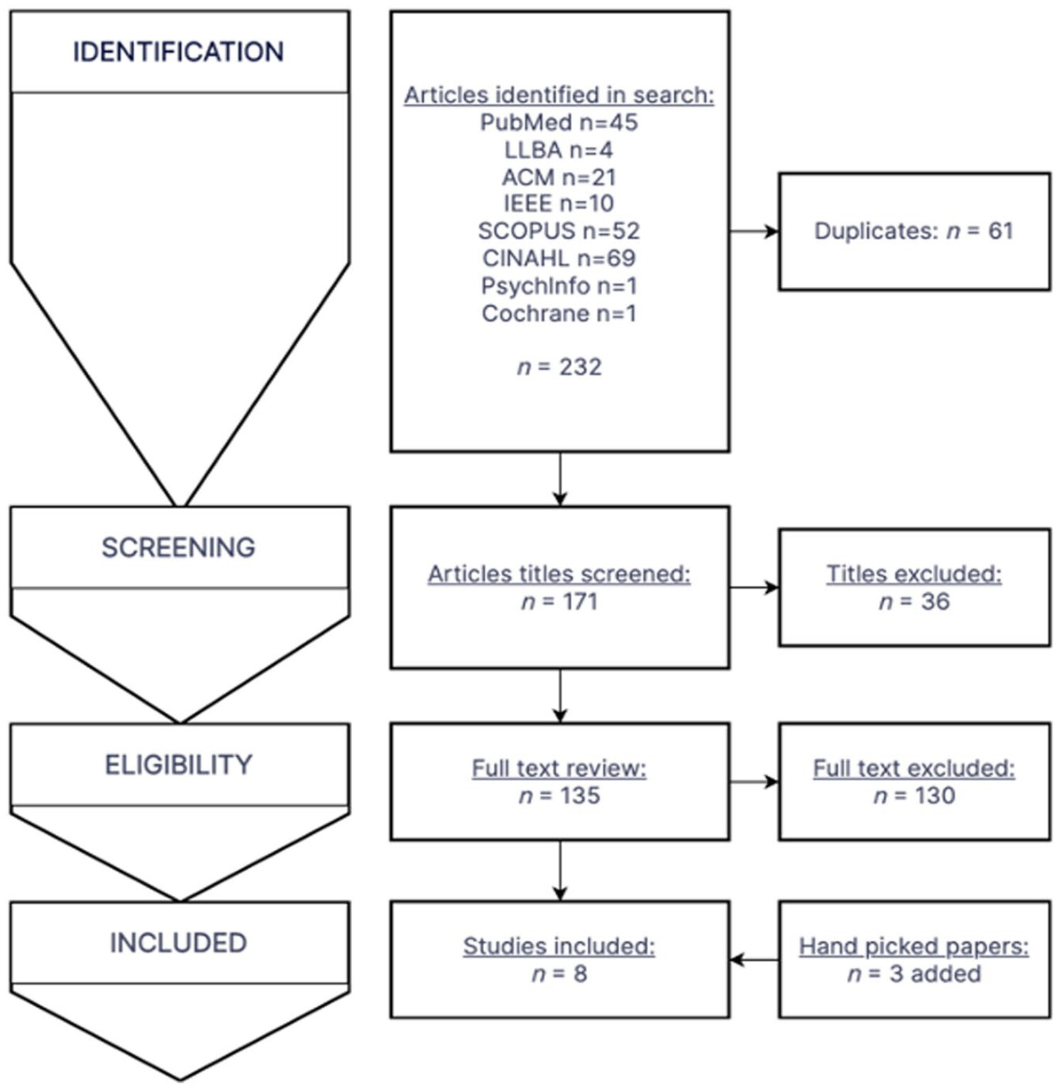 k = 1). From the review of citations, 3 handpicked papers were additionally included, which were all from databases not searched in the initial search. In total, 8 articles met all criteria and were eligible for inclusion in the systematic review. The attrition flowchart detailing the study section is shown in