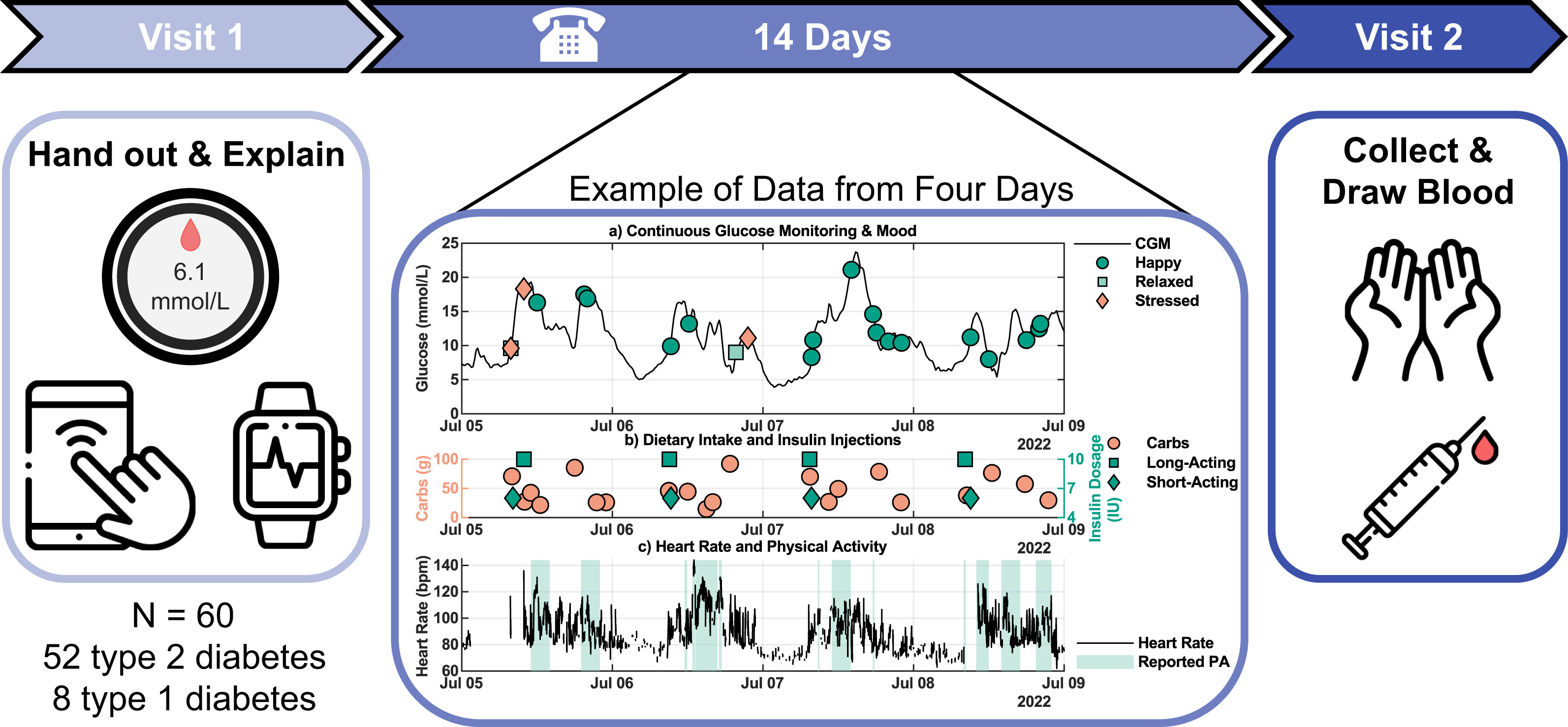 9,10The use of wearable devices in diabetic populations for data collection in free-living conditions has, except for a few studies, been mostly limited to the effects on blood glucose levels of physical activity, diet, or psychological stress alone. Of the few studies that simultaneously collected data on a broader range of variables, nearly all of these studies have been conducted on individuals with type 1 diabetes. Sample sizes in these studies ranged from 9 to 497 participants, with study periods of up to 8 weeks, and measurements on blood glucose levels, exercise, insulin dosing, dietary intake, heart rate, psychological status, electrocardiograms, breathing, and accelerometers.
